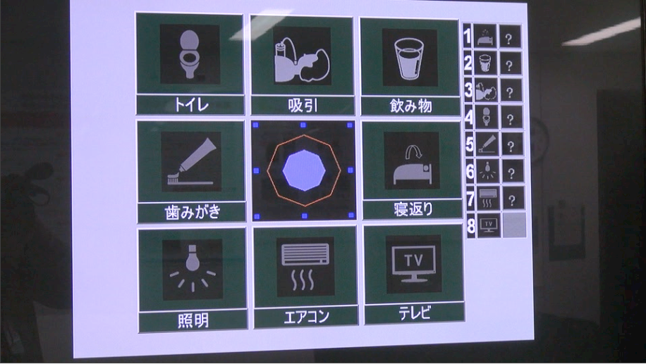 Another screen, used by the patient, shows eight panels displaying physical activity choices — elimination of bodily waste, phlegm-clearing, drinking, being physically turned over, having a TV, air conditioner or light turned on, or having teeth brushed.