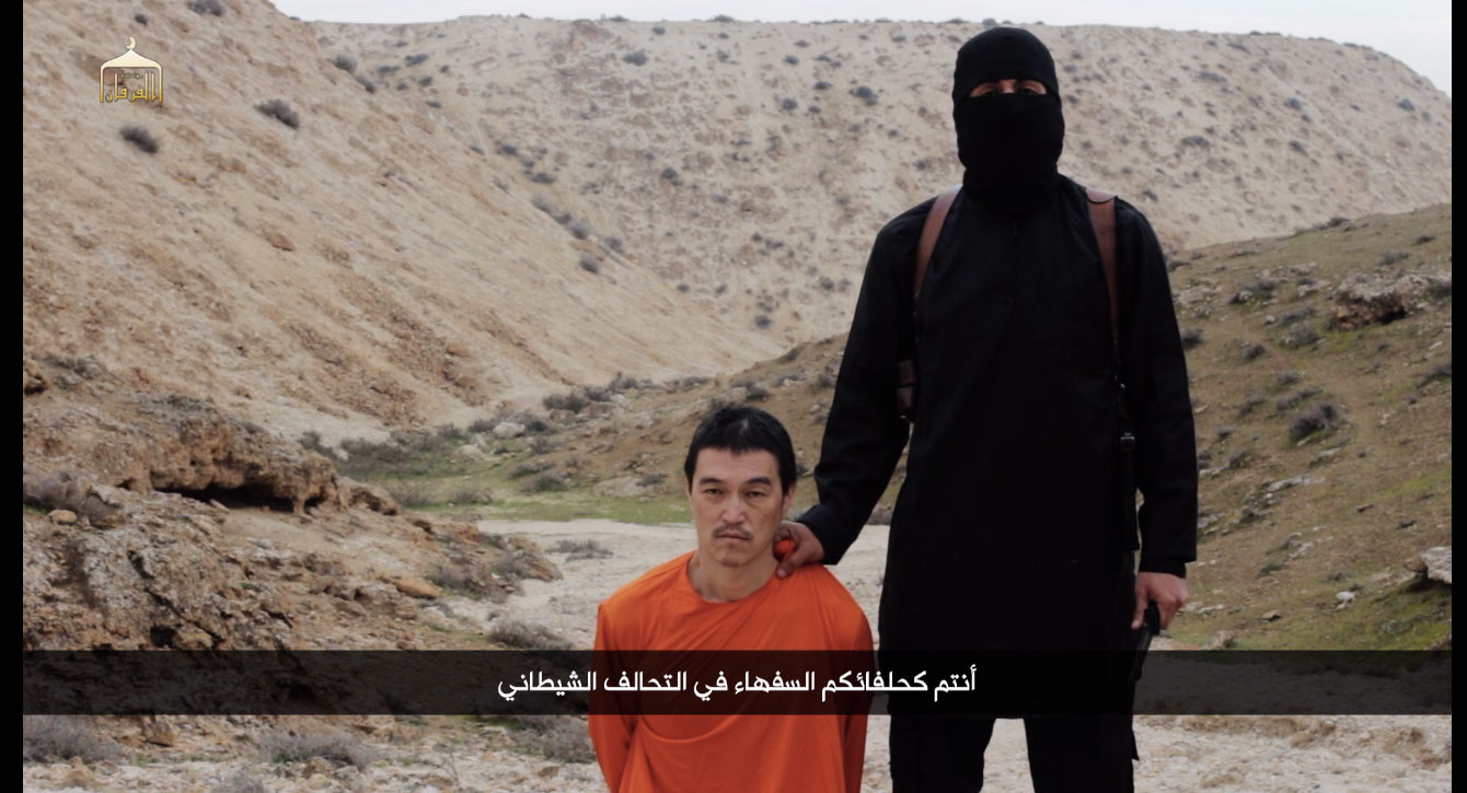 Brandishing a knife and speaking in his familiar British-accented English, he says: "To the Japanese government. You, like your foolish allies in the satanic coalition, have yet to understand that we, by Allah's grace, are a large Islamic caliphate with authority and power and an entire army thirsty for your blood.