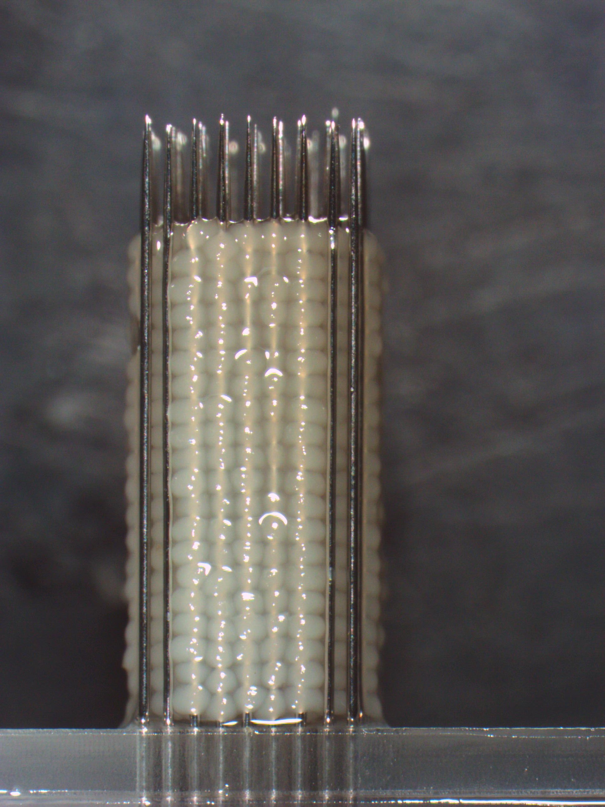 Kuchiishi said Koichi Nakayama, a research adviser to Cyfuse who came up with the method of stacking spheroids on needle arrays, used to place the minuscule spheroids manually. The 3-D printer can dramatically speed up the process, he said.