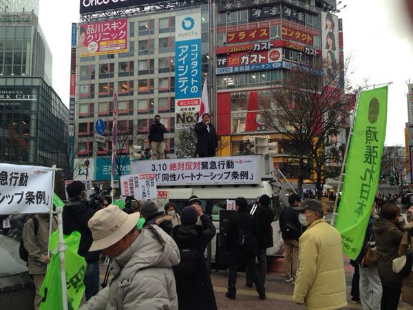 The conservative group Ganbare Nippon! Zenkoku Kodo Iinkai (Committee Promoting Nationwide Action to Root for Japan) staged a vociferous protest against the initiative in front of the ward office and JR Shibuya Station on Tuesday.