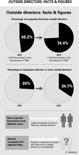 More Japanese firms are appointing outside directors to strengthen their corporate governance, pushed by a revised law and new rules that are set to come into effect in the coming months.