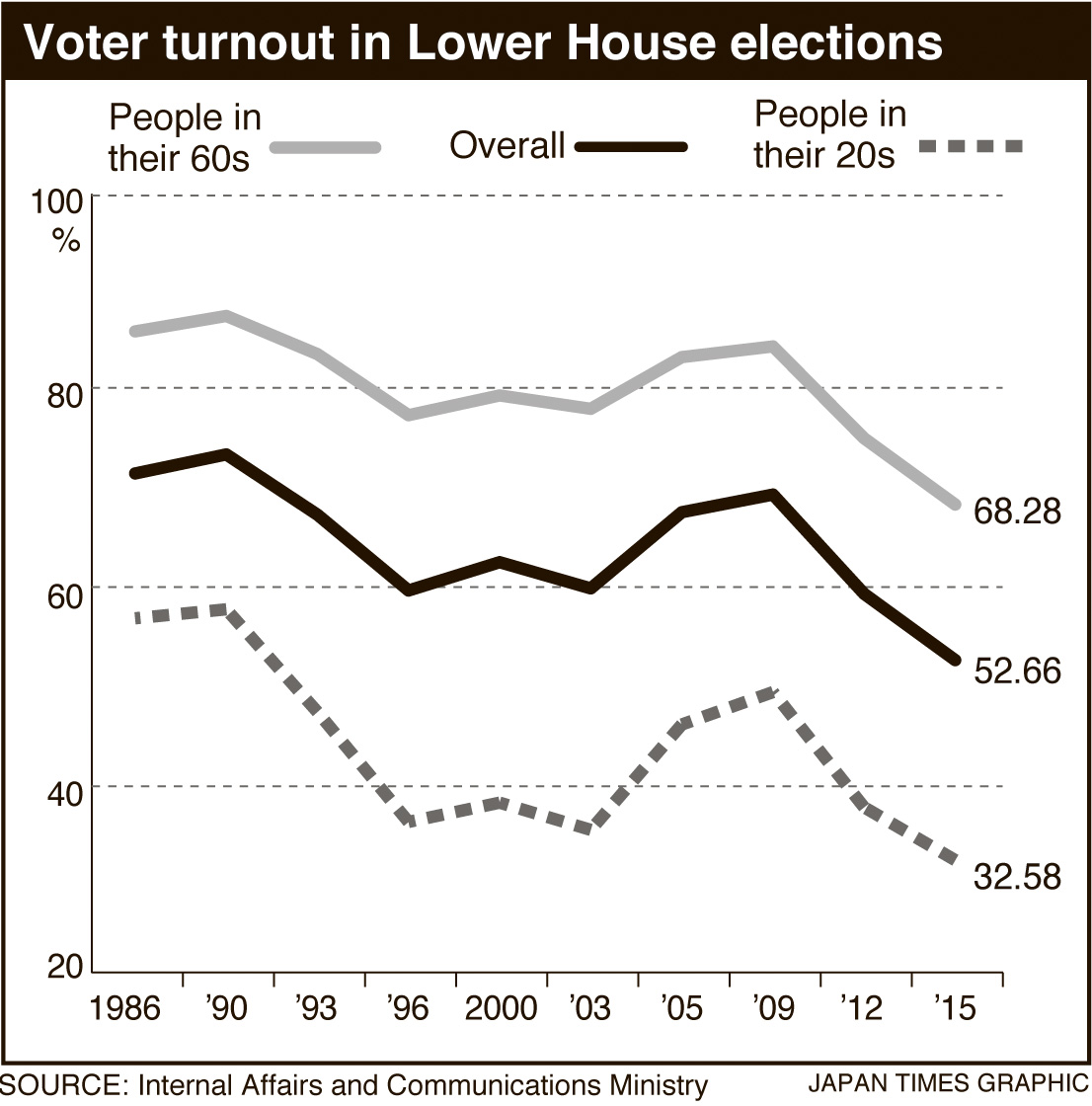 Also, young people have shown little interest in politics, at least at the national level. In last December's snap Lower House election, only 32.6 percent of voters in their 20s went to the polls, while 68.3 percent of those in their 60s did. But Tanaka of Sophia University said some municipal-level referendums held in the past, in which 18-year-olds or even 16-year-olds were asked to participate, have shown that young people were more keen to be involved in issues that affect their communities.