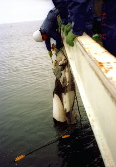 Fischer said he also witnessed birds and mammals such as Dall's porpoises and Pacific white-sided dolphins getting snared in the mesh and drowning. Being mammals, they died after being held under and deprived of air.