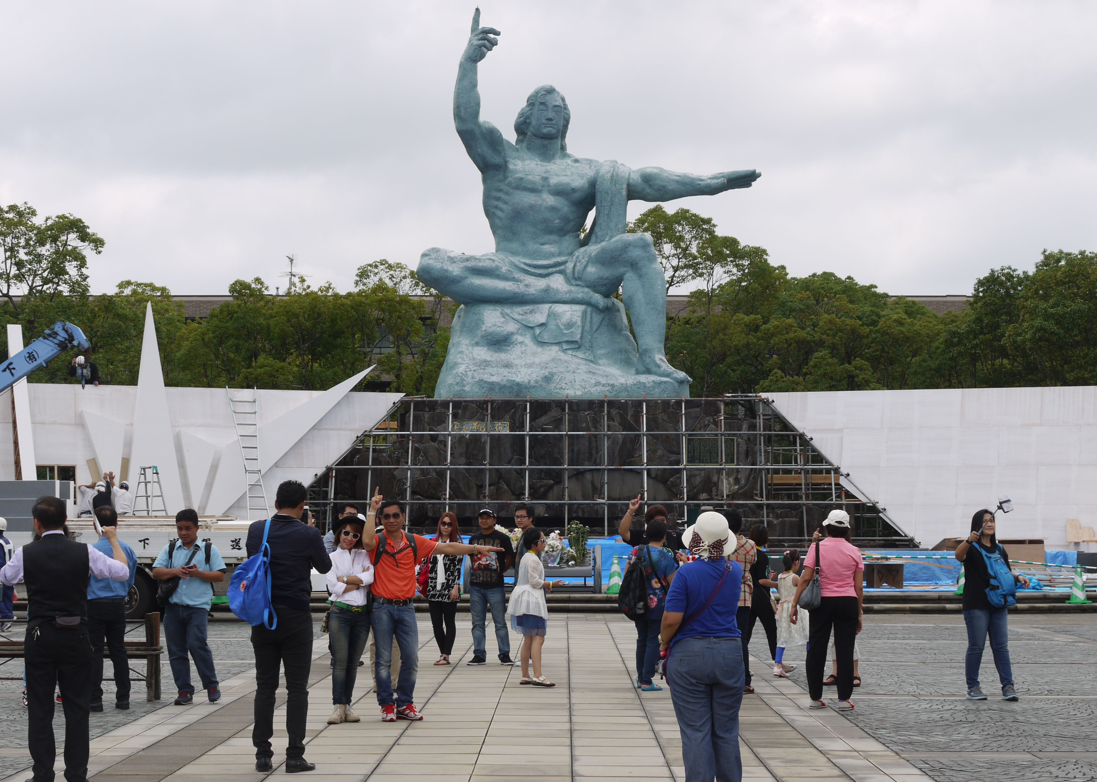 August is high season for tourism in Nagasaki. One morning last week at the Nagasaki Peace Park, the venue for an annual televised ceremony to commemorate the Aug. 9, 1945, atomic bombing of the city, throngs of tourists wearing name tags hanging from their necks were shuffling in and out of buses, snapping pictures in front of the iconic Peace Statue.
