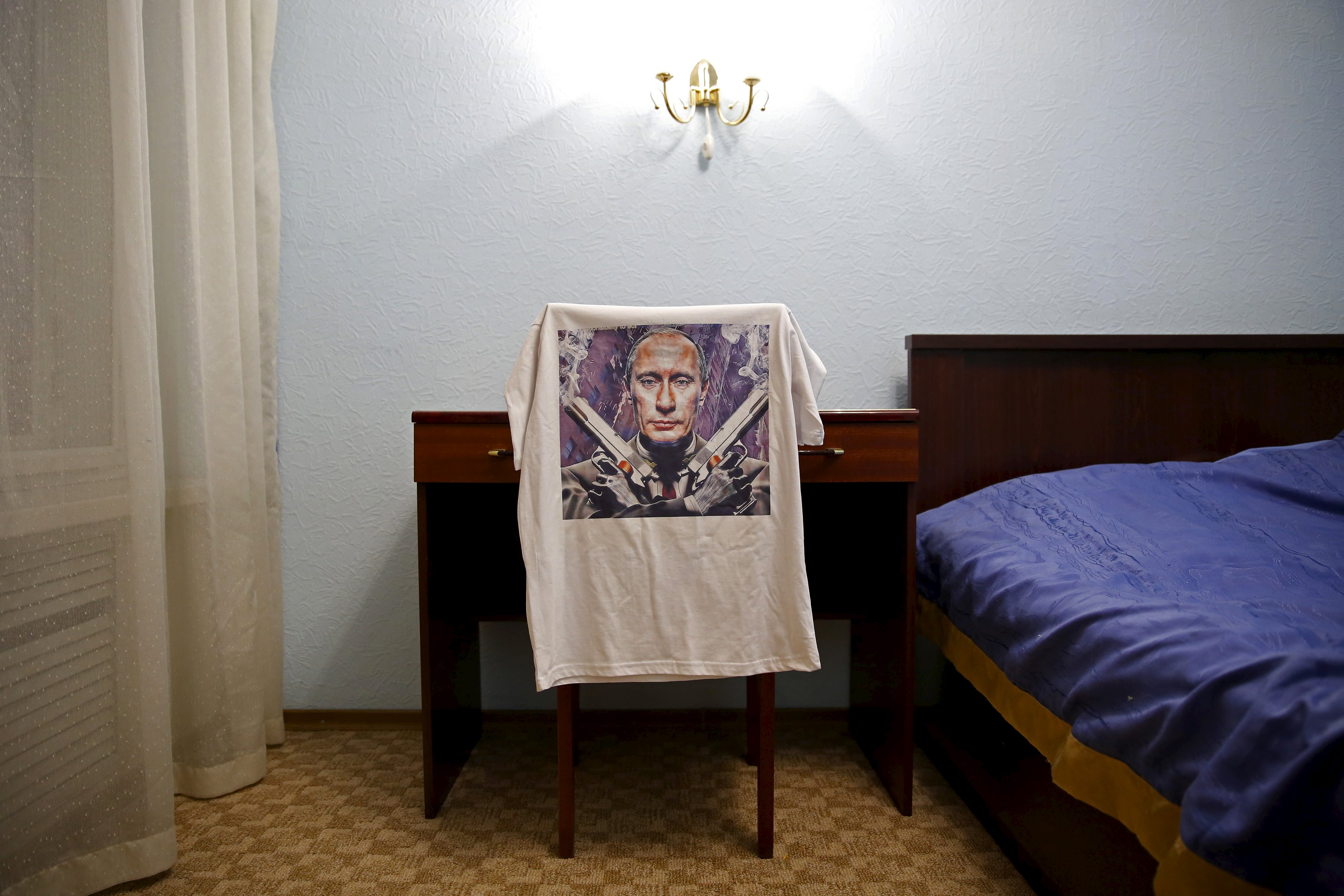 One of the most popular images adorning T-shirts and smartphone covers is a simple photo portrait of Putin looking remote and inscrutable behind dark glasses.