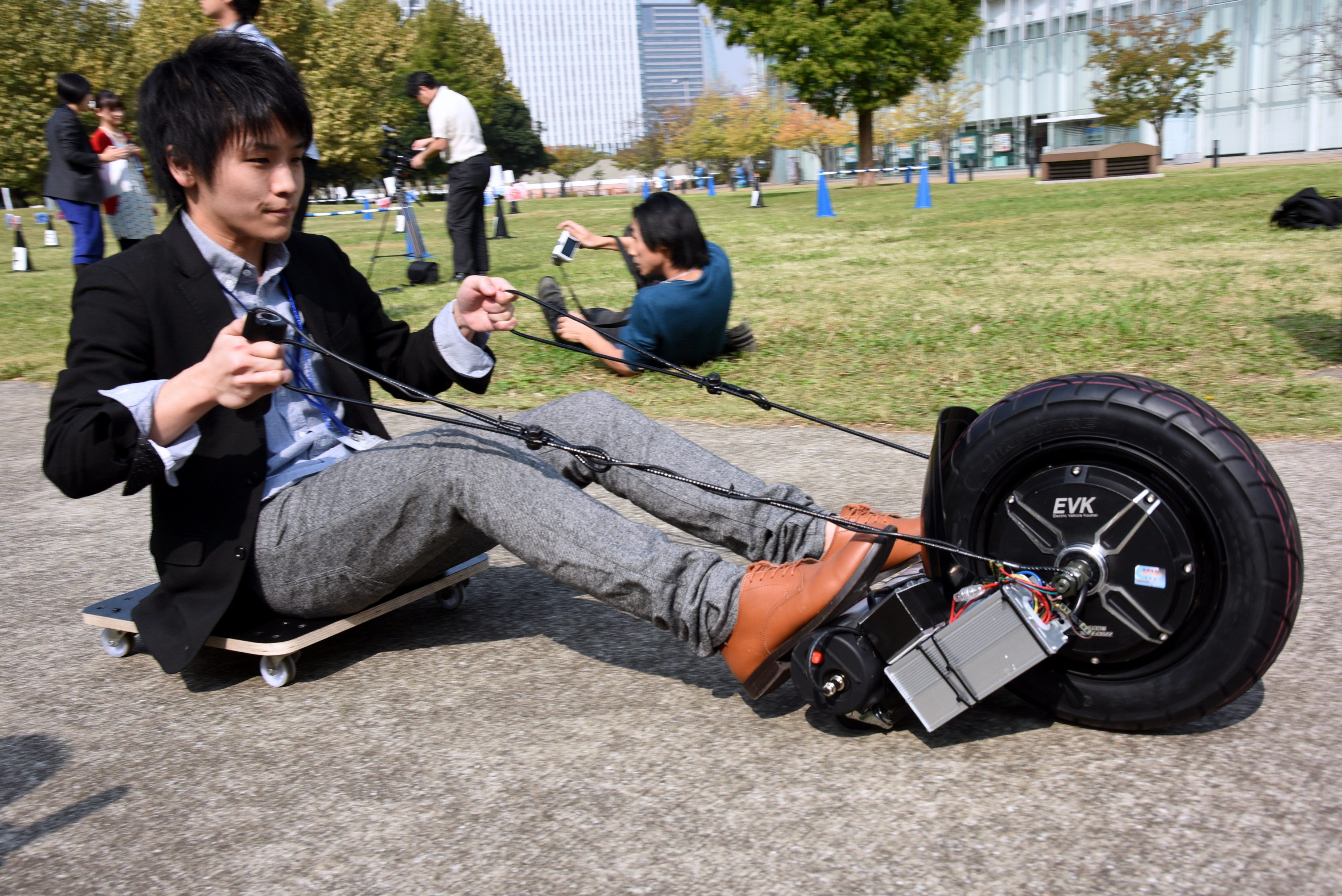In a game called "Chariot," players race each other while pulled by self-propelled wheel.