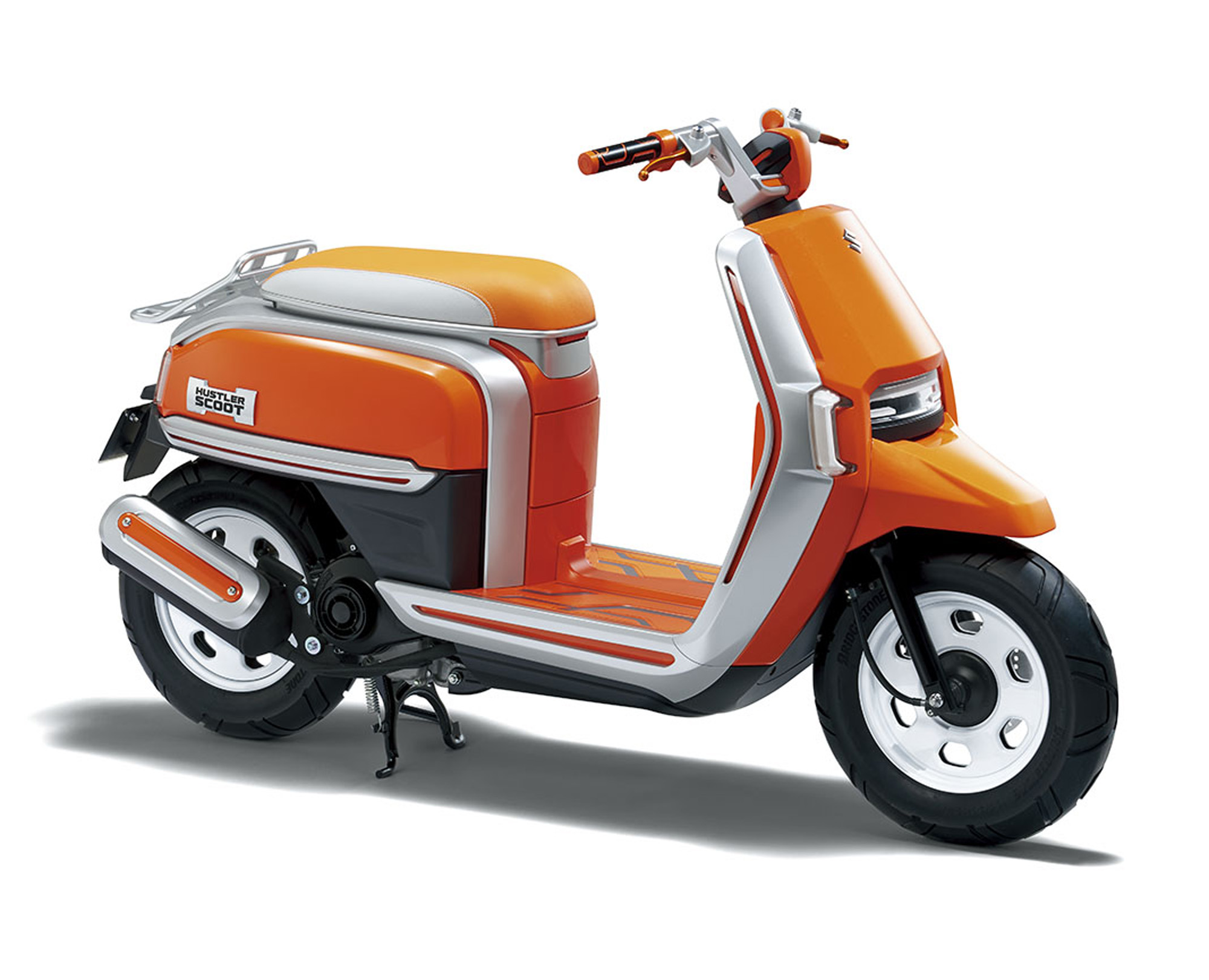 The Hustler Scoot is a concept model of a rider-friendly 50 cc scooter with luggage space for a variety of purposes. A conventional under-seat luggage bay is complemented by a removable, handheld luggage case that mounts between the rider's feet. There's more room for luggage on the rear carrier and on the sides of the bodywork.