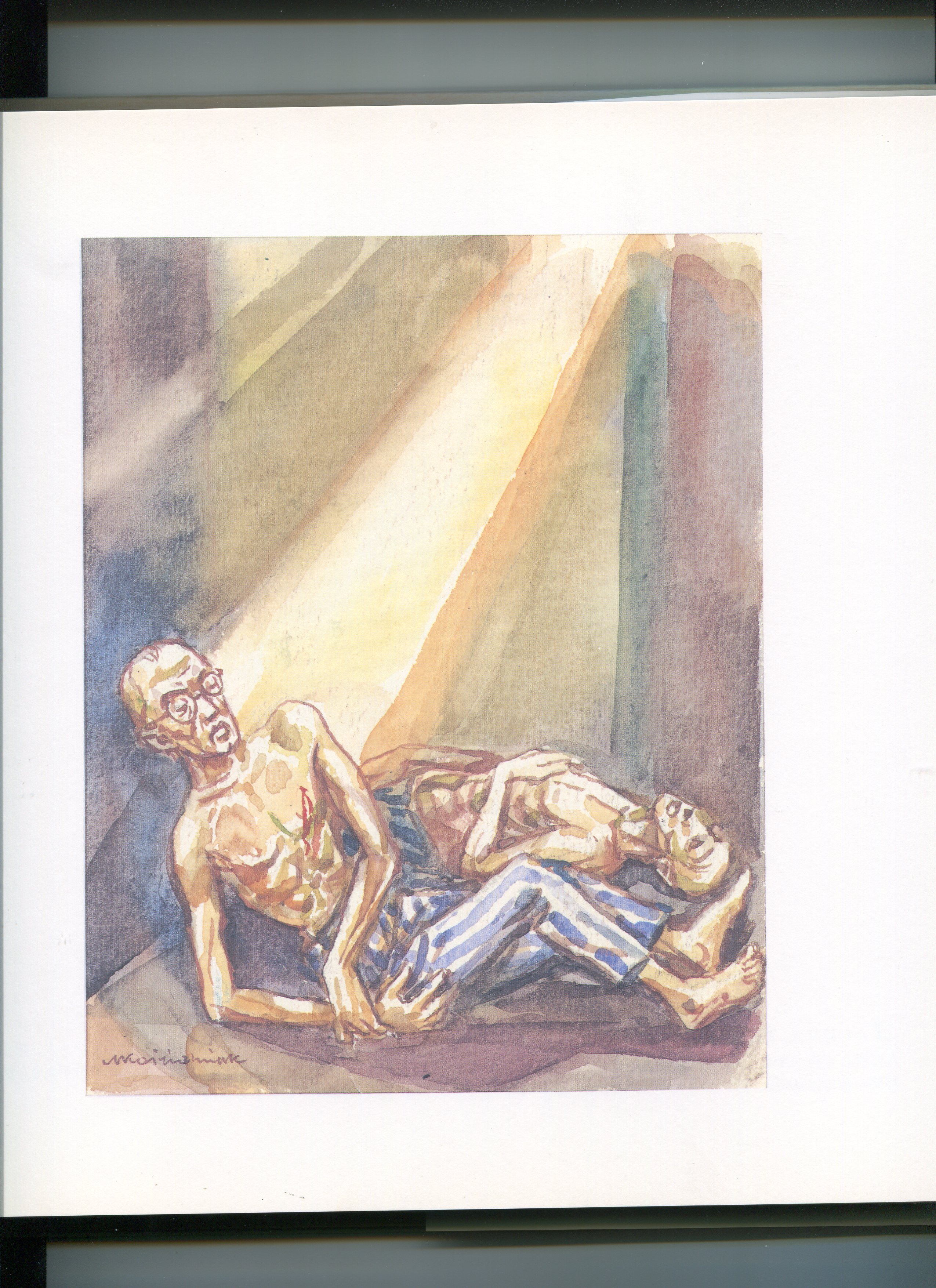 The drawings, smuggled out of the camp with help from underground organizations, depict prisoners tortured by SS troops. Some portray one of the artist's contemporaries at the camp, Saint Maximilian Kolbe, a priest inmate who volunteered his life in place of a stranger's.