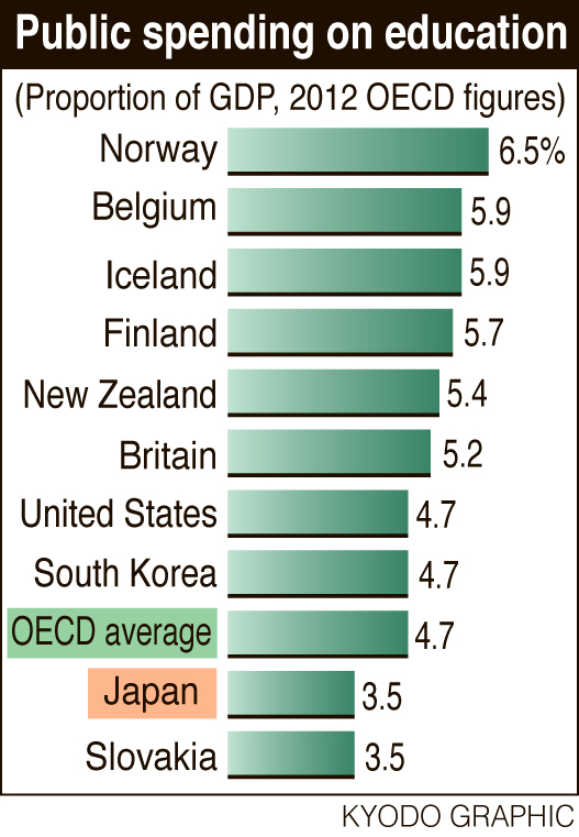 Education at a Glance 2015, released by the Paris-based economic institution on Tuesday, found that, in a category covering education all the way from primary school to college, Japan's public spending amounted to just 3.5 percent of its GDP. That was the lowest percentage among 32 of the 34 OECD members where data were available, sharing the bottom spot with Slovakia, against an OECD average of 4.7 percent.