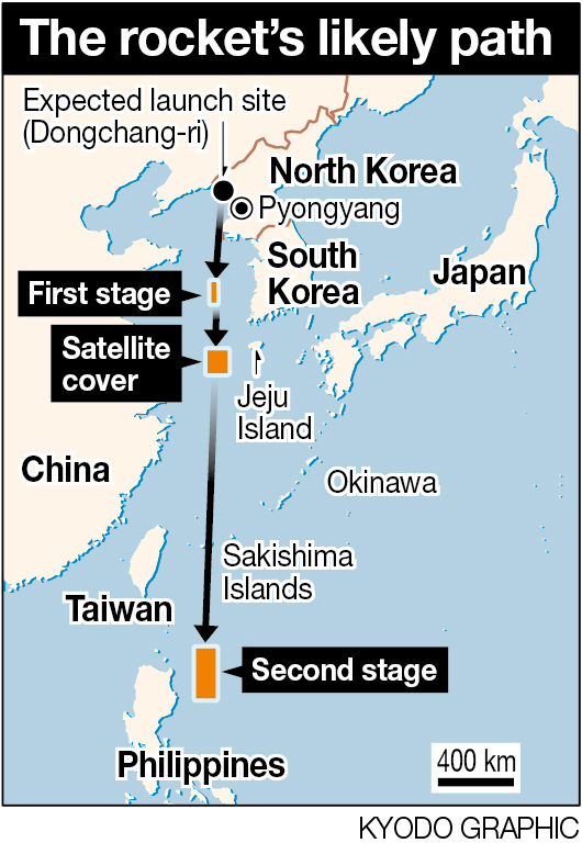 During a daily news conference, Chief Cabinet Secretary Yoshihide Suga pointed out that the projectile, expected to be launched from a site in western North Korea, would fly over part of the Sakishima island chain of Okinawa Prefecture, which includes the islands of Ishigaki and Miyako.