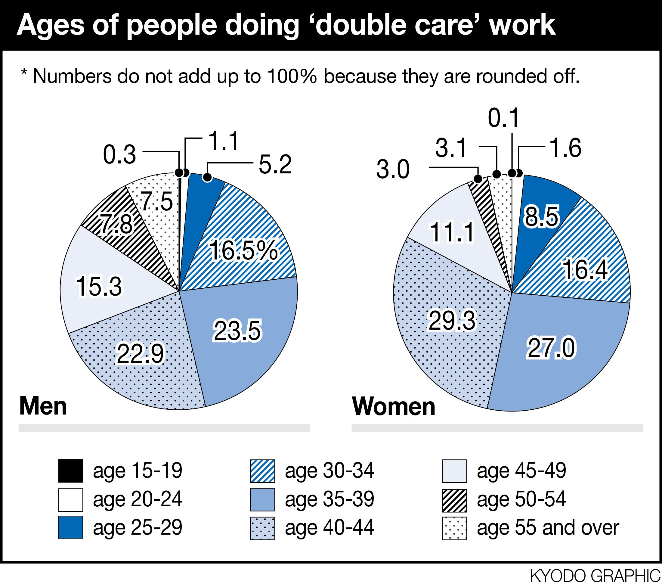 By gender, women were found to be much more likely to undertake what in Japan is widely called "double care," numbering 168,000, as opposed to 85,000 men.