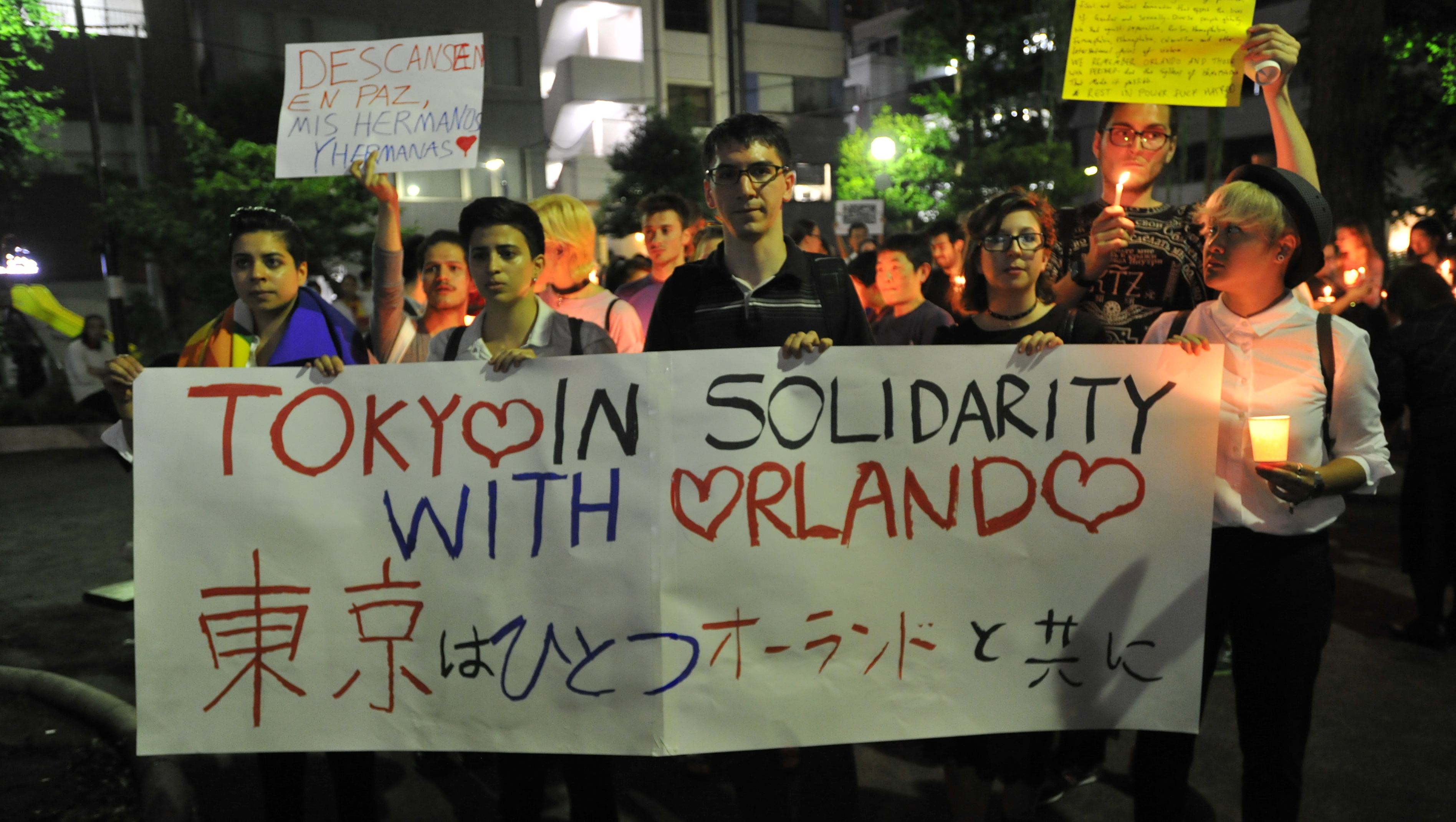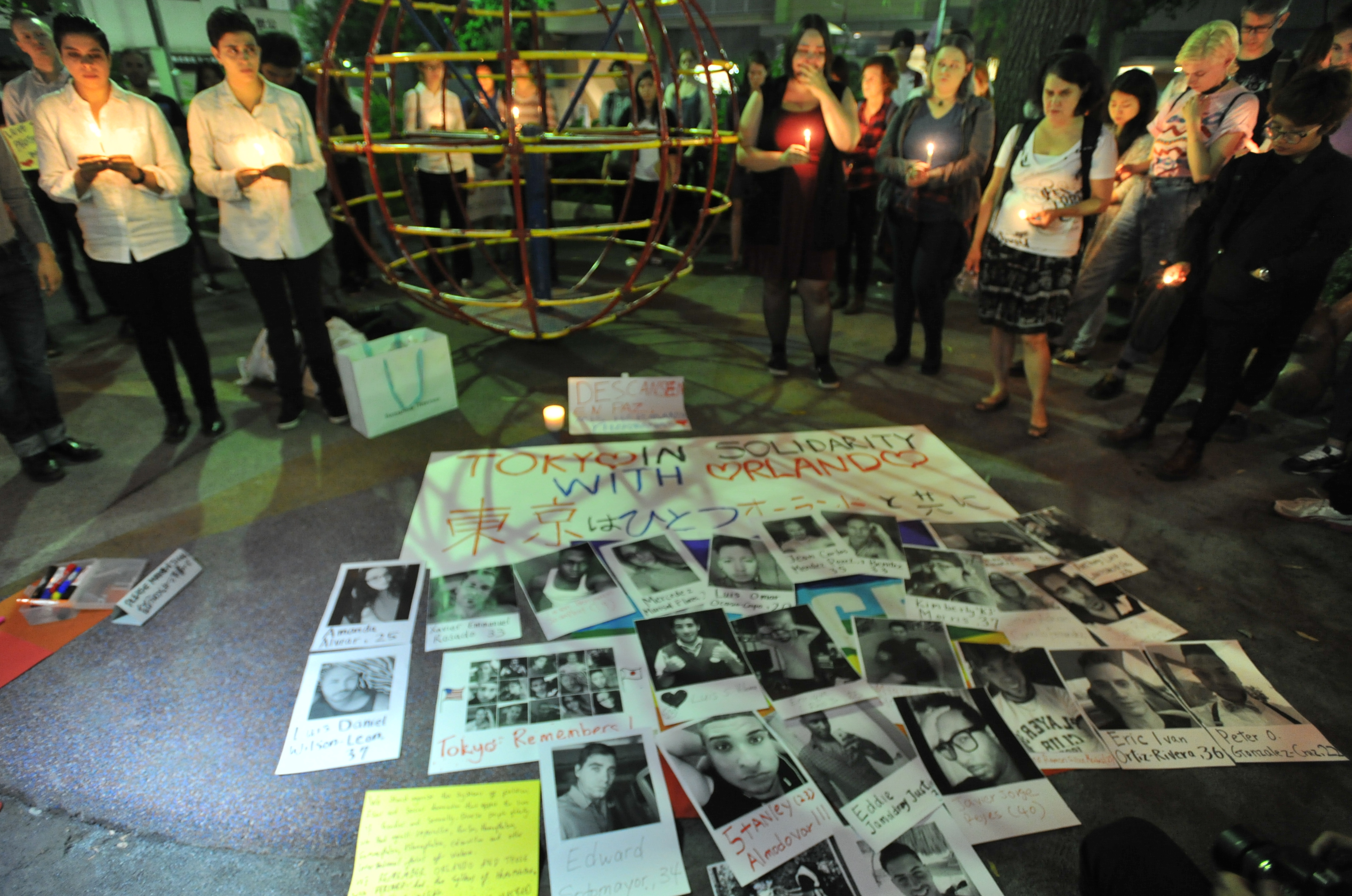 A large crowd gathered Tuesday evening in Tokyo's Shinjuku district for a candlelight vigil to mourn the victims of the LGBT nightclub massacre in Orlando, Florida.