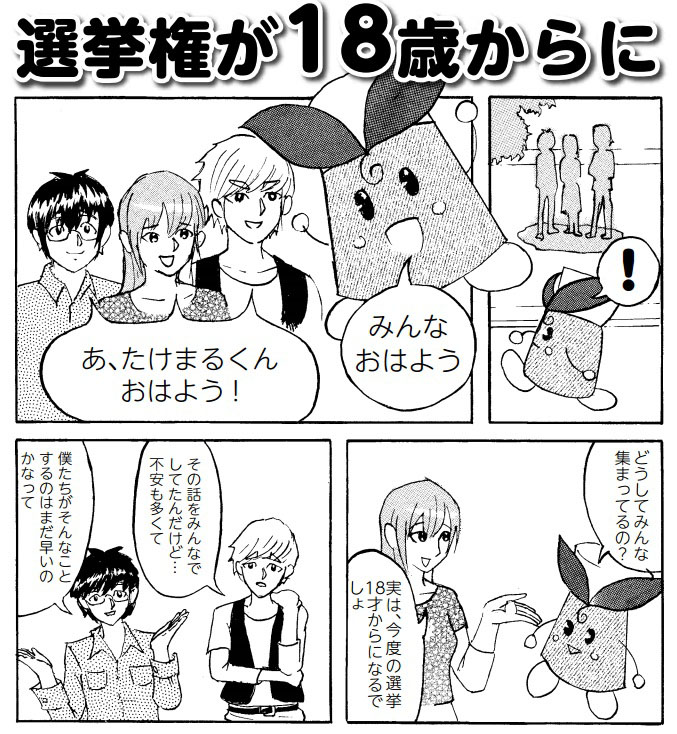 Takemaru-kun tells a group of 18-year-olds that because they didn't have the right to vote before now, it was difficult for society to reflect their views. But if young people vote, even older politicians will be forced to listen, the mascot adds.