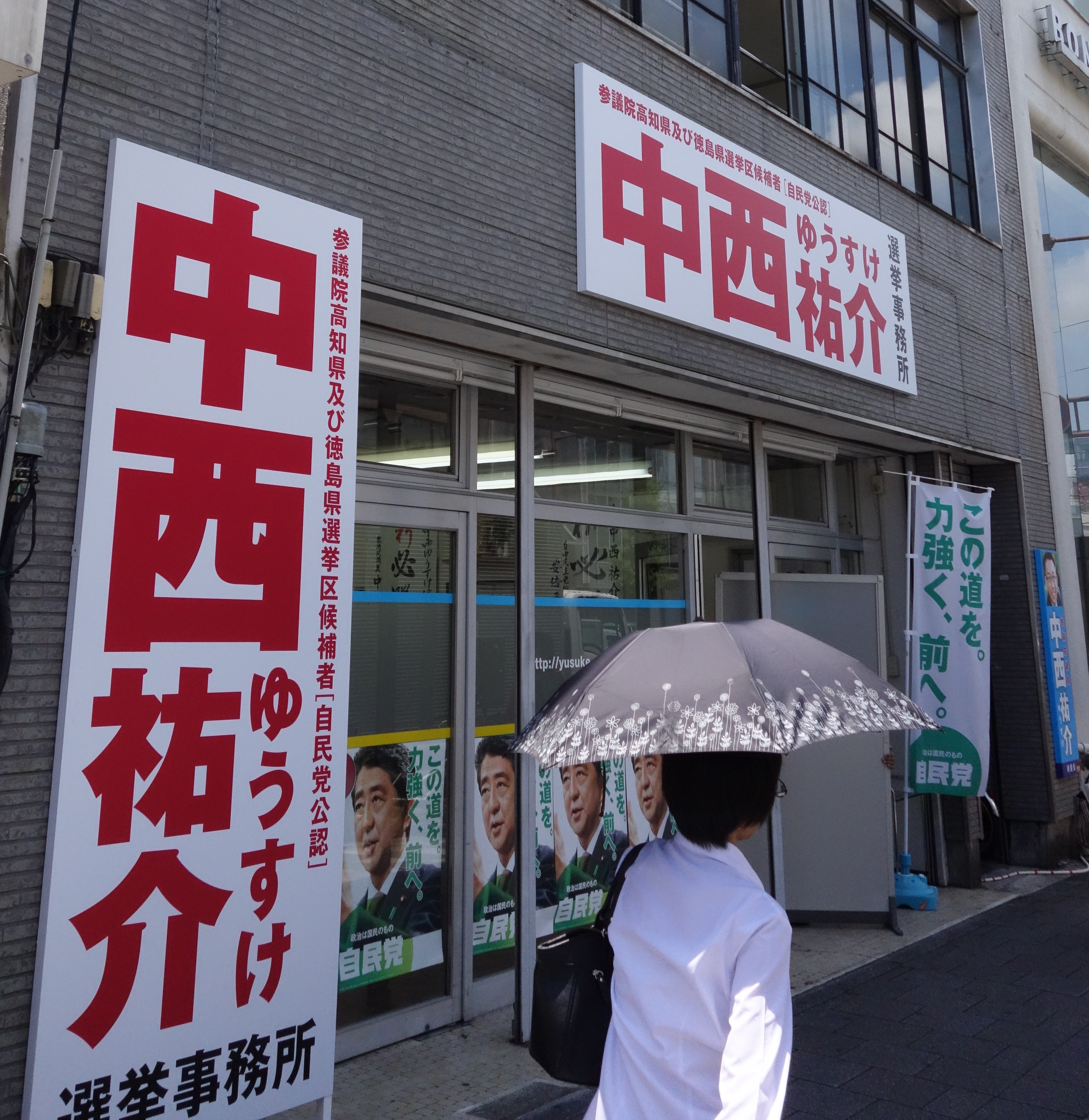 Onishi's main rival, Yusuke Nakanishi of the ruling Liberal Democratic Party, is also skipping the prefecture throughout the same week. Instead his wife, Saki, is attending rallies in Kochi, accompanied by local LDP assembly members who deliver speeches on Nakanishi's behalf.