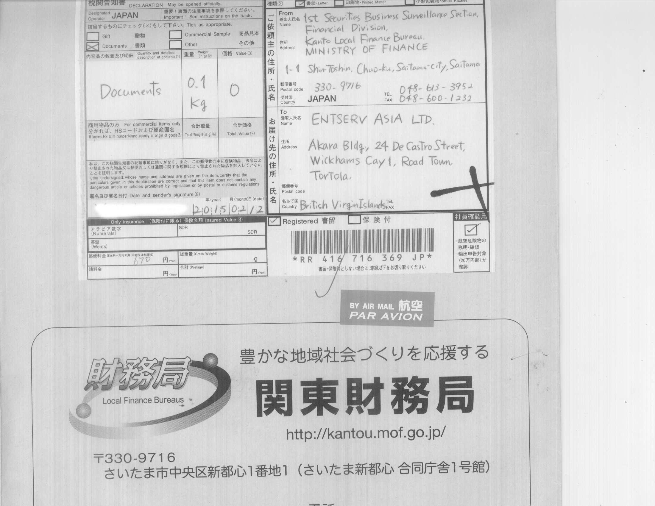 The leaked documents show that Entserv Asia's address was the same as its registered agent's, Mossack Fonseca, in the British Virgin Islands. It is to that address that in February 2015 the Kanto Finance Bureau sent an envelope that contained the warning letter alleging the company was "soliciting over-the-counter derivative transactions on the internet." The bureau employee in charge of the case confirmed the content.