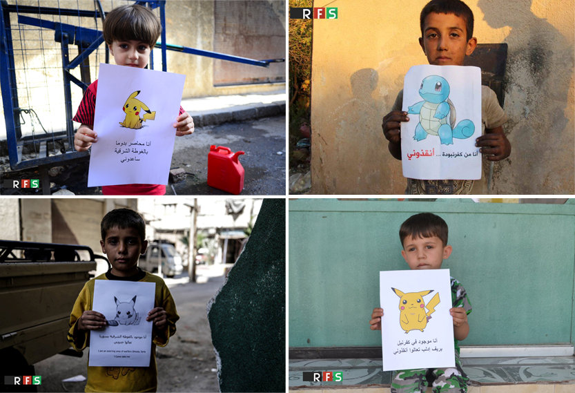 The Revolutionary Forces of Syria (RSF) Media Office, a group of media activists that supports rebel forces opposed to Syrian President Bashar Assad, has posted to social media dozens of gut-wrenching photos and posters depicting Syrian children from different provinces holding pictures of Pokemon characters with the slogans "I'm from Syria ... help me" and "I'm from Syria ... find me."