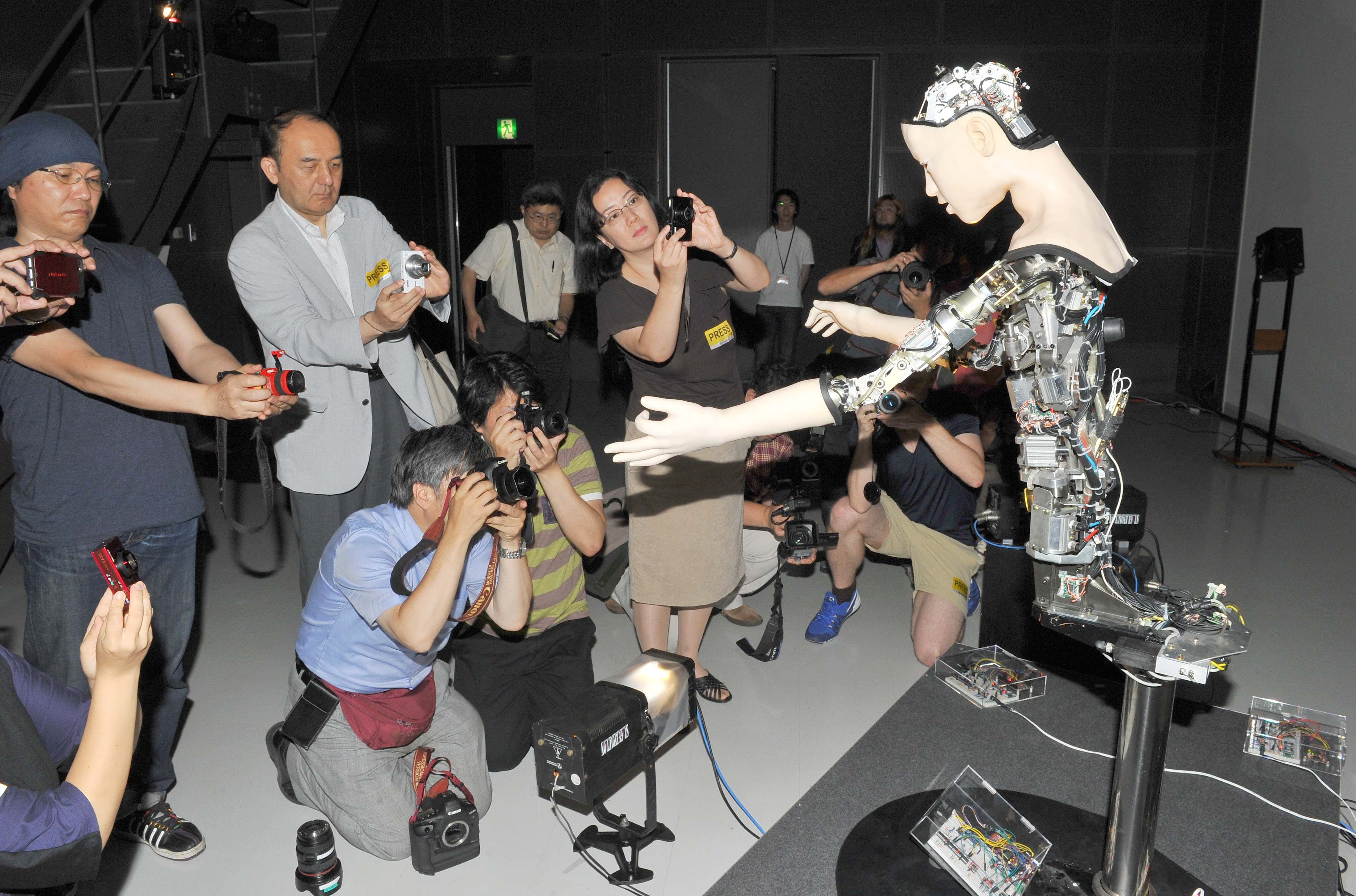When a group of reporters entered a dark exhibition room where tranquil ambient music was playing, Alter started to swing its arms and body to and fro, as if it were pleased to see so many people. Occasionally, it would lean its body toward them and move its mouth, as if trying to say something.