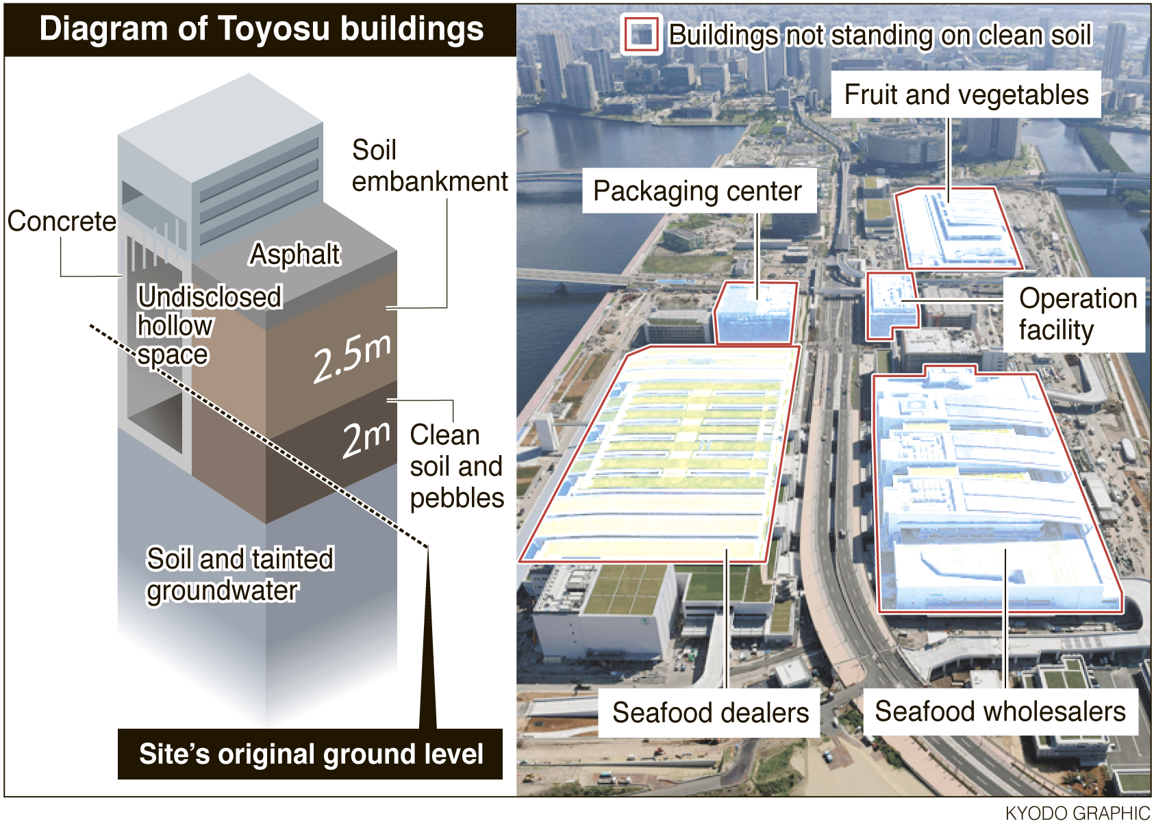 But on Sept. 10, Koike revealed this 4.5-meter layer of soil was missing from under the five main structures at the new market. So instead of sitting on a foundation of clean soil, the five structures were built on hollow concrete utility rooms filled with pipes and electrical cables. These undisclosed structures occupy about a third of the 40-hectare Toyosu site, which was built on reclaimed land.