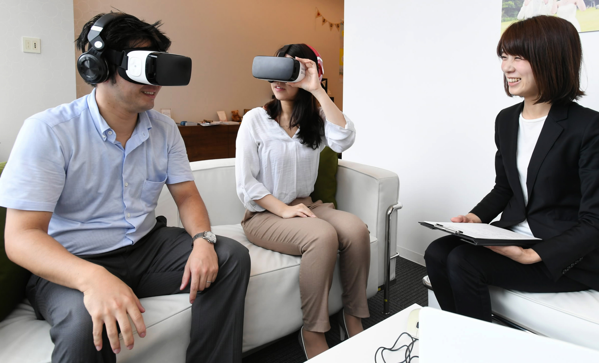 Ateam's app, named Sugukon VR, fusing sugu (soon) with kon from kekkon (marriage), is used with headphones and goggles that people slip their smartphones into. It is unique because the videos are taken from the perspectives of both bride and groom.Other attempts at VR software merely imposed clients' images on magazine ads for wedding locations, but Ateam strove to make the experience more realistic by advancing to videos and audio.