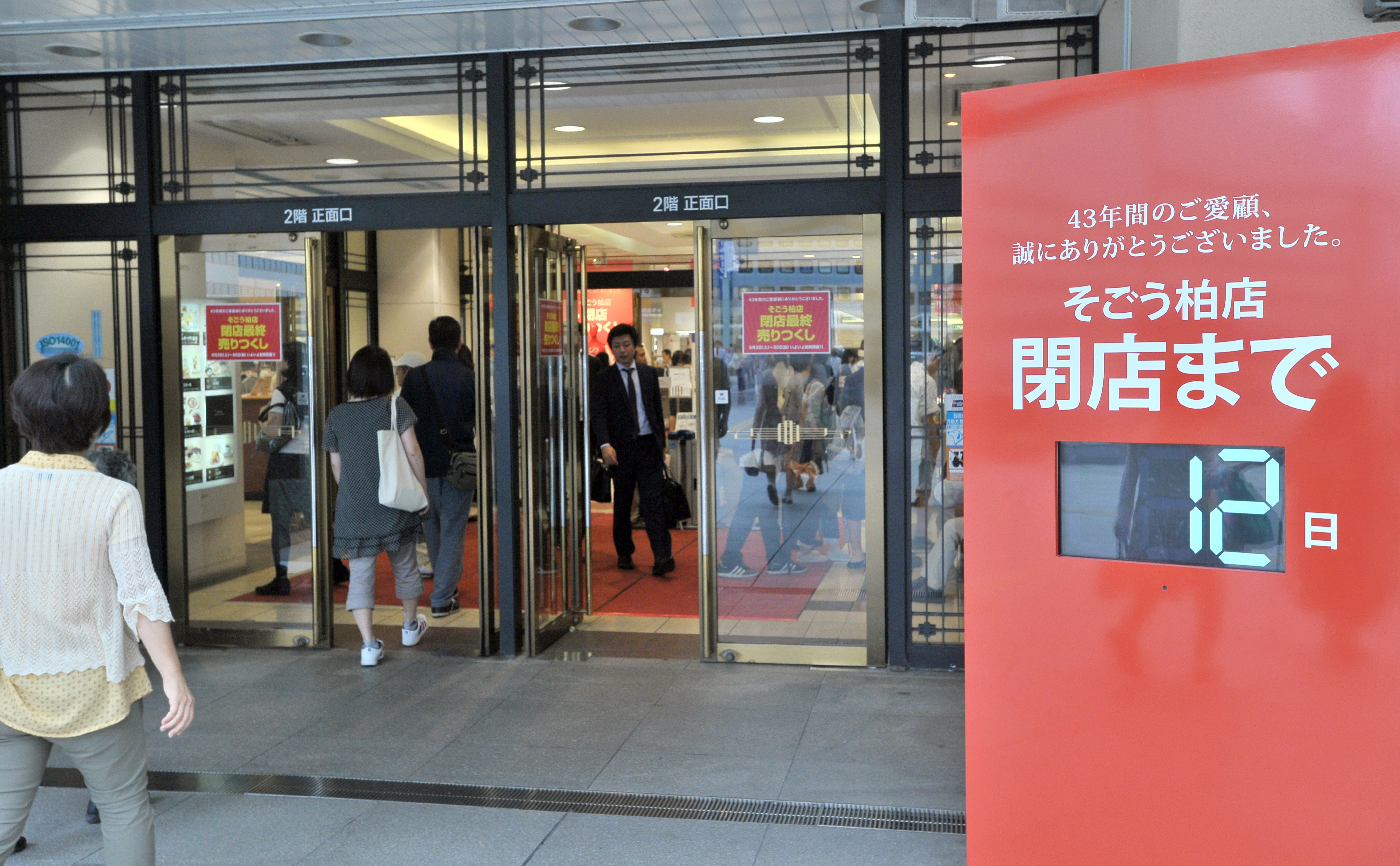 Sogo is among a string of department stores in the suburbs and rural areas shutting down due to falling sales. Kashiwa Sogo saw sales fall to ¥11.5 billion in the business year through February, accounting for roughly 20 percent of its record ¥59 billion sales in the business year that ended in February 1991.
