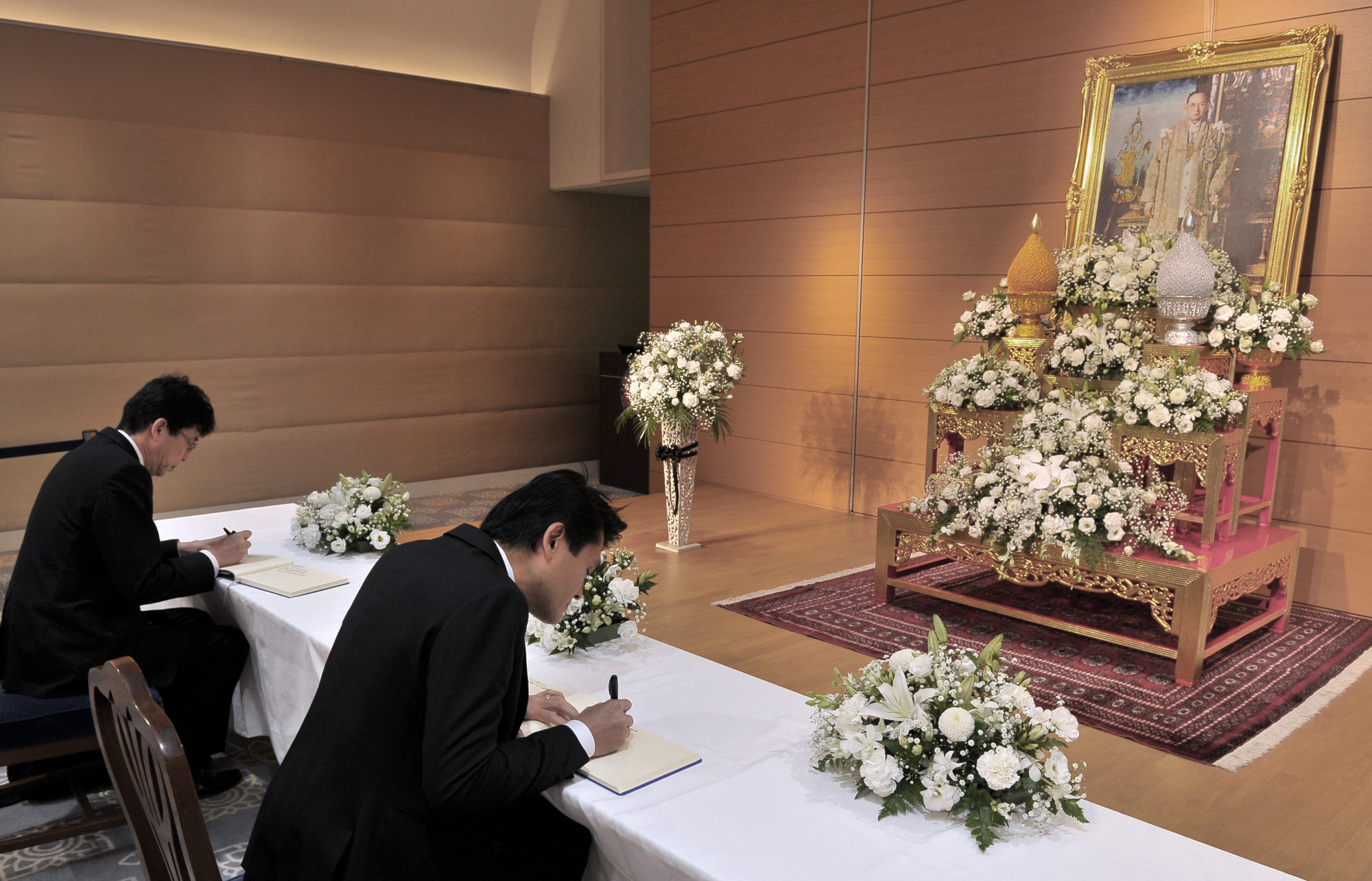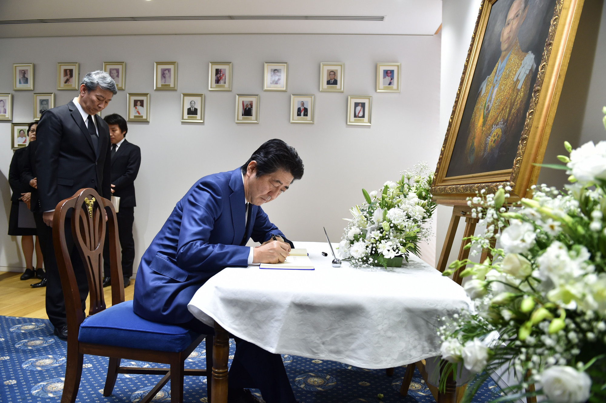 On Friday, Abe visited the Thai Embassy in Shinagawa Ward, Tokyo. He bowed before a portrait of the king and signed a book of condolences.