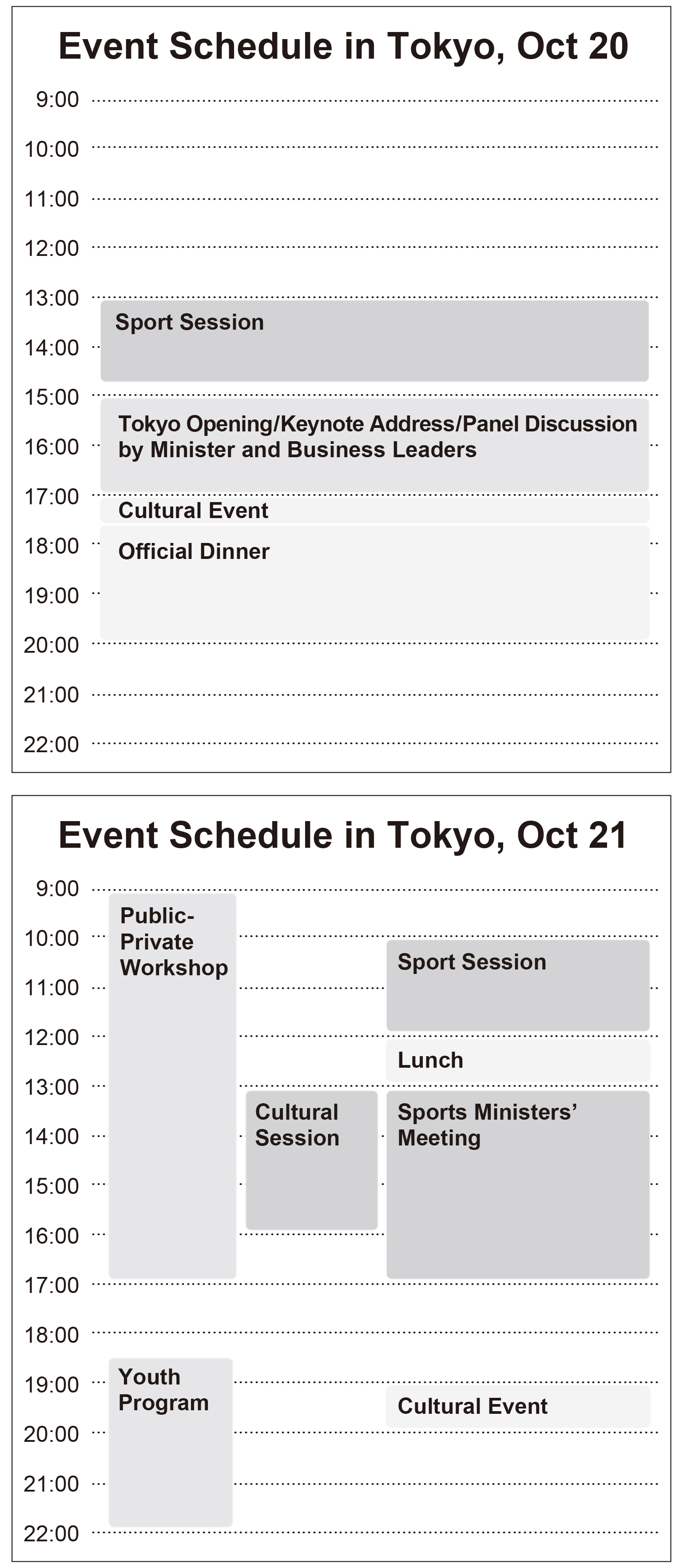 Three sports sessions are scheduled for Tokyo on the "Appeal of Rugby, Power of the Rugby World Cup," "The Legacies Created by the Olympics and Paralympics" and "Sports Ministers' Meeting."
