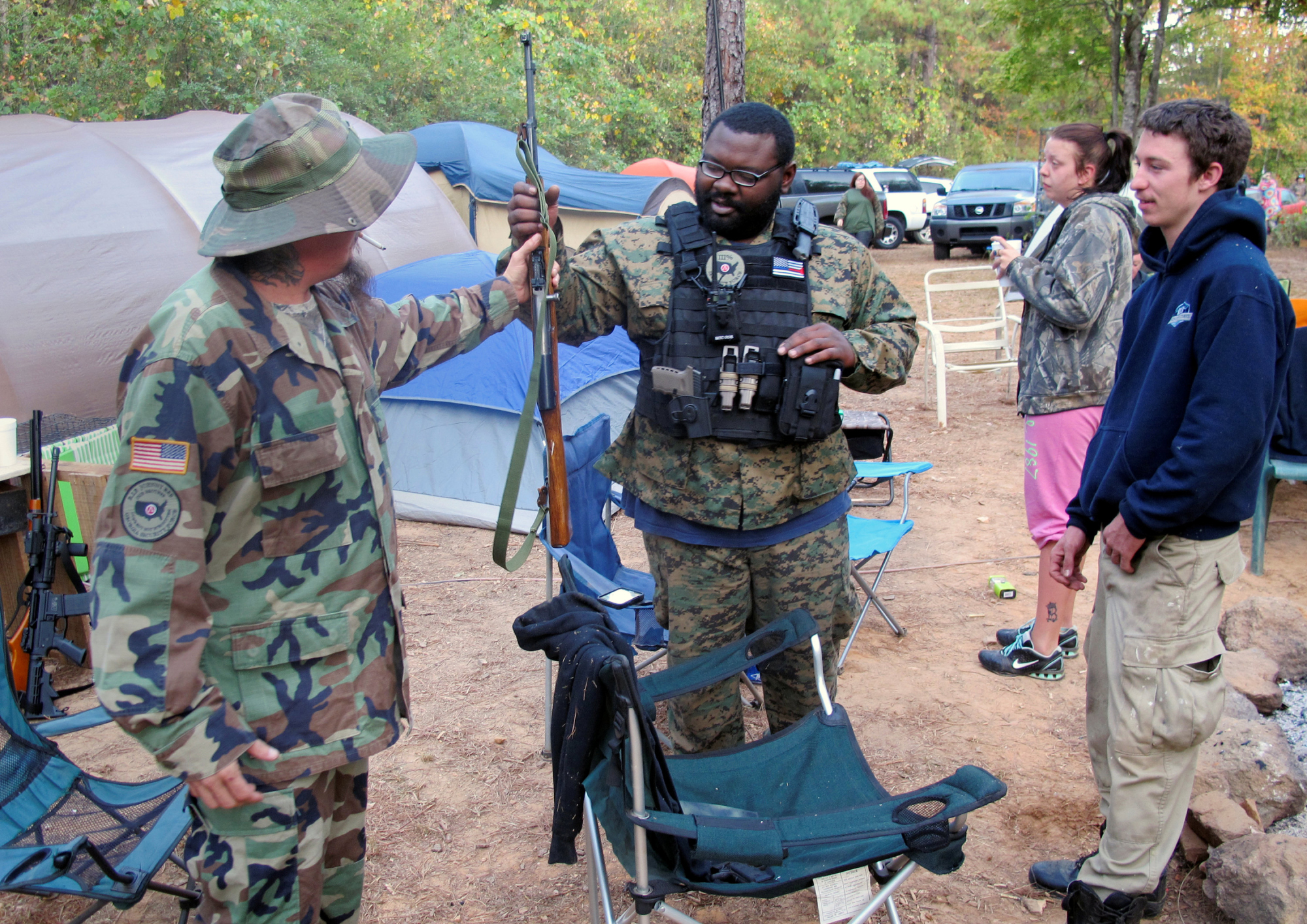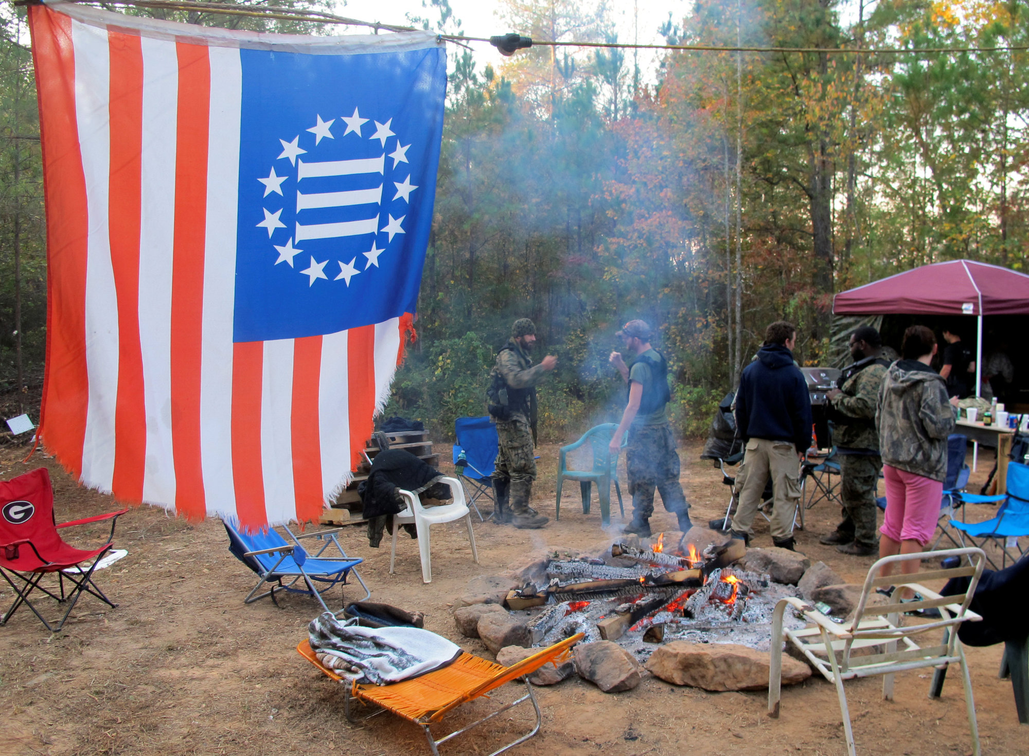 An hour south of Atlanta, the Three Percent Security Force started the day around the campfire, taking turns shooting automatic pistols and rifles at a makeshift target range. They whooped with approval when blasts from one member's high-powered rifle knocked down a tree.