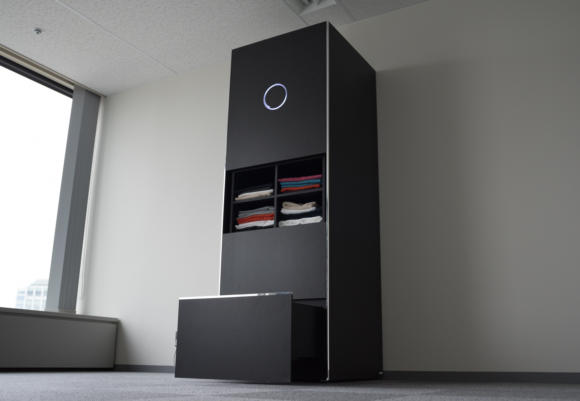 Sakane wouldn't disclose how Laundroid works, but patents show that users dump clothes in a lower drawer and robotic arms grab each item as scanners look for features such as buttons or a collar. Once identified, the clothes are folded using sliding plates and neatly stacked on upper shelves for collection.
