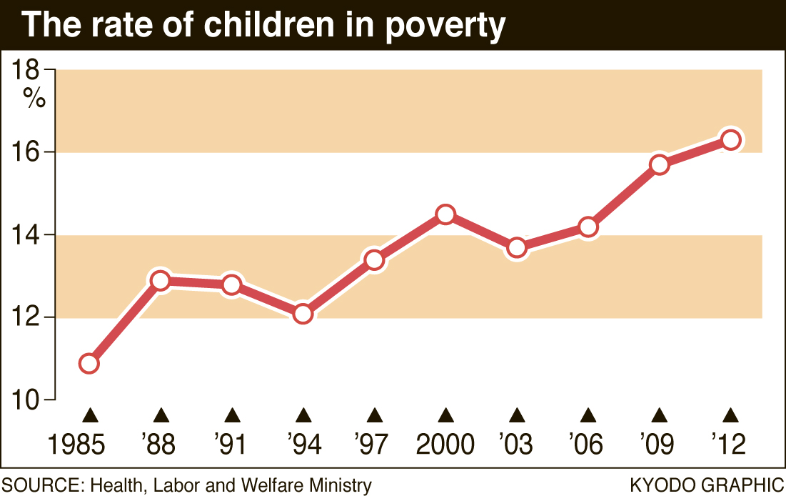 According to the Health, Labor and Welfare Ministry, the relative poverty rate — the percentage of children living under the poverty line — has increased from 10.9 percent in 1985 to 16.3 percent in 2012. The figure translates into roughly 1 in 6 children.