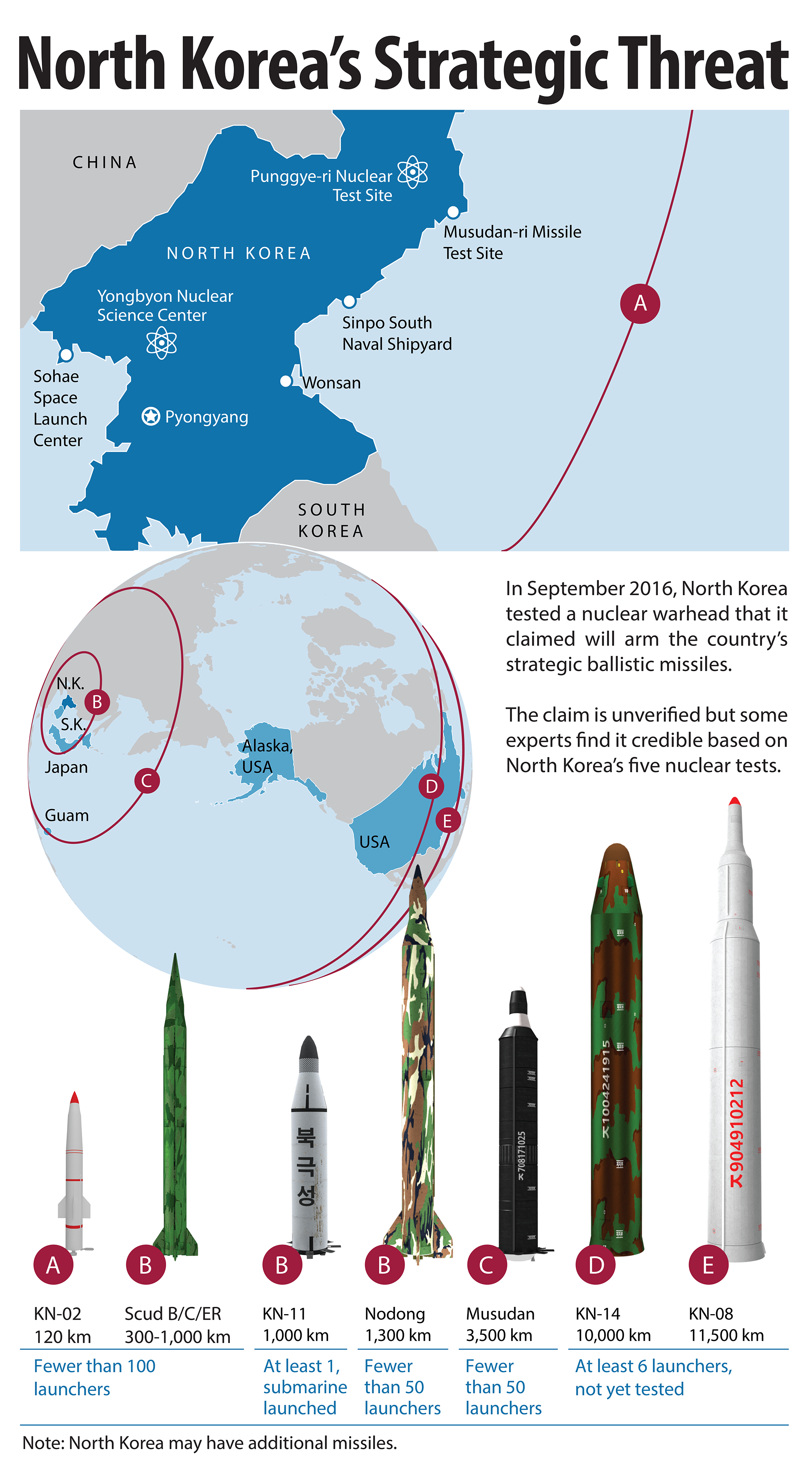 "Missiles that put Japan at risk would be the SLBM (and its land-based variant, the Pukkuksong-2), ER Scud, Nodong, Musudan and up," said David Schmerler, a researcher at the Center for Nonproliferation Studies at the Middlebury Institute of International Studies in California.