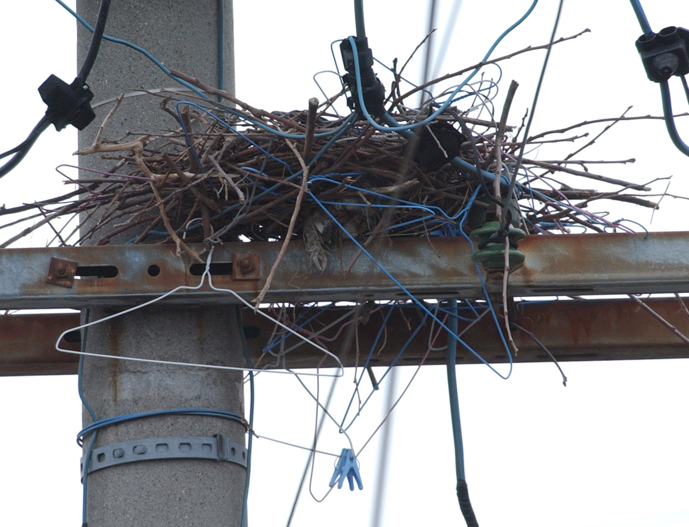 Crows often use metal clothes hangers and twigs as a base material, but they don't hold up well to wind and rain and tend to fall away. Sometimes when this happens the hangars get caught in the power lines, causing a short circuit.