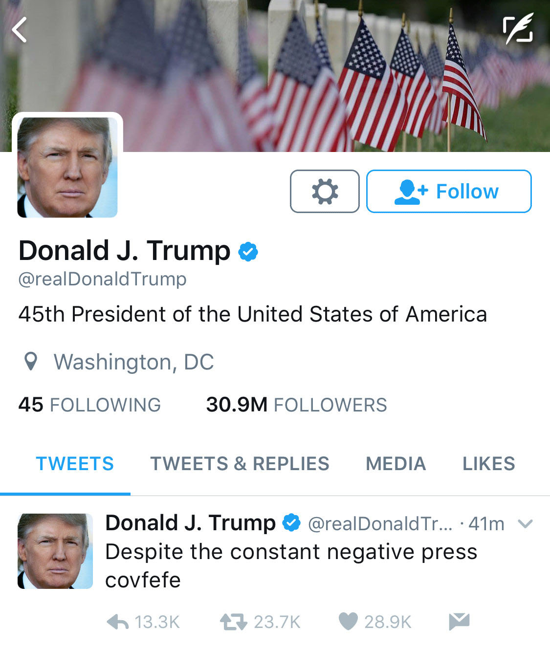 "I have no idea what the intended form of covfefe is, but it seems that Trump mistyped — and a new vocabulary word burst onto the scene," Twitter user @nakashima1106 wrote Wednesday.