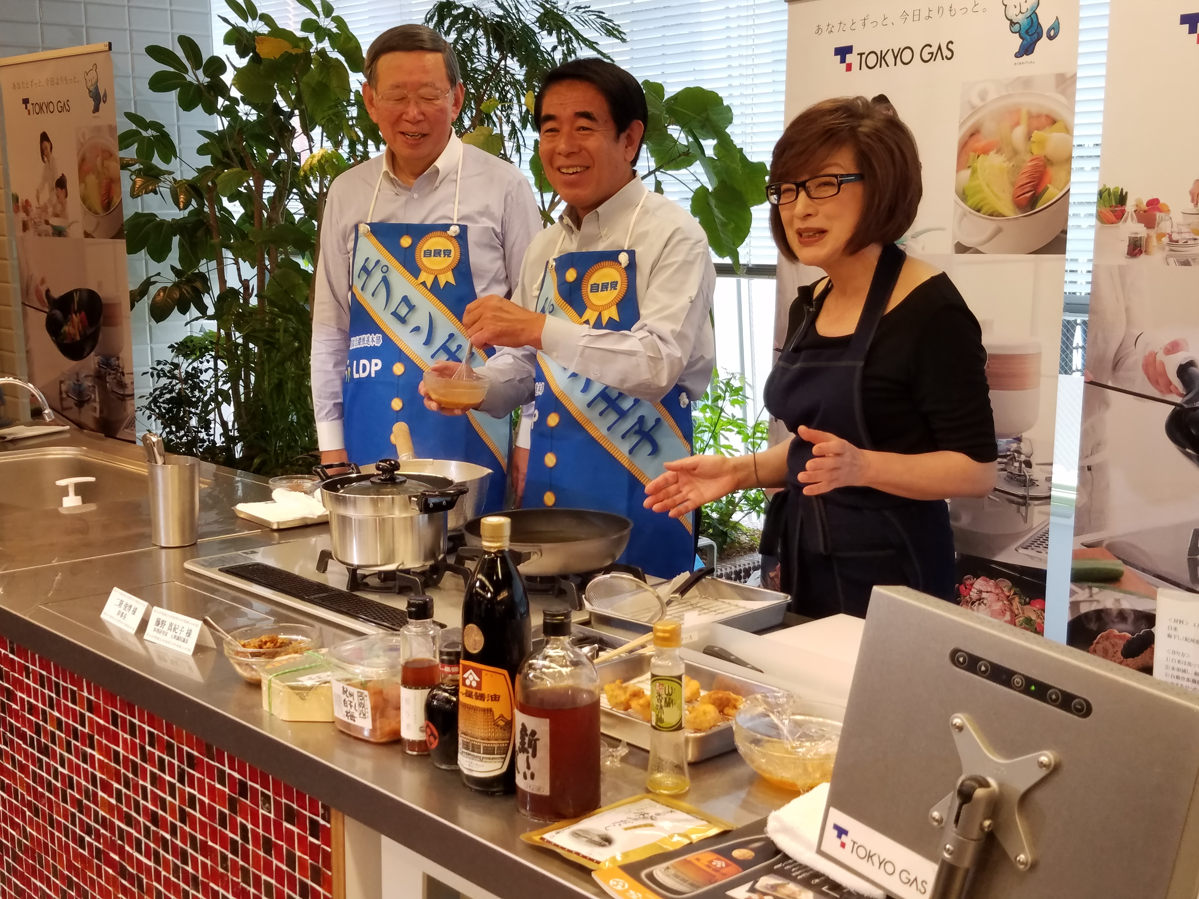 The event, organized by a group of LDP lawmakers campaigning for greater female empowerment, saw party heavyweights such as Hakubun Shimomura and Hiroyuki Hosoda picking up kitchen skills from a cooking expert as they struggled to make basic dishes such as karaage, or deep-fried chicken.