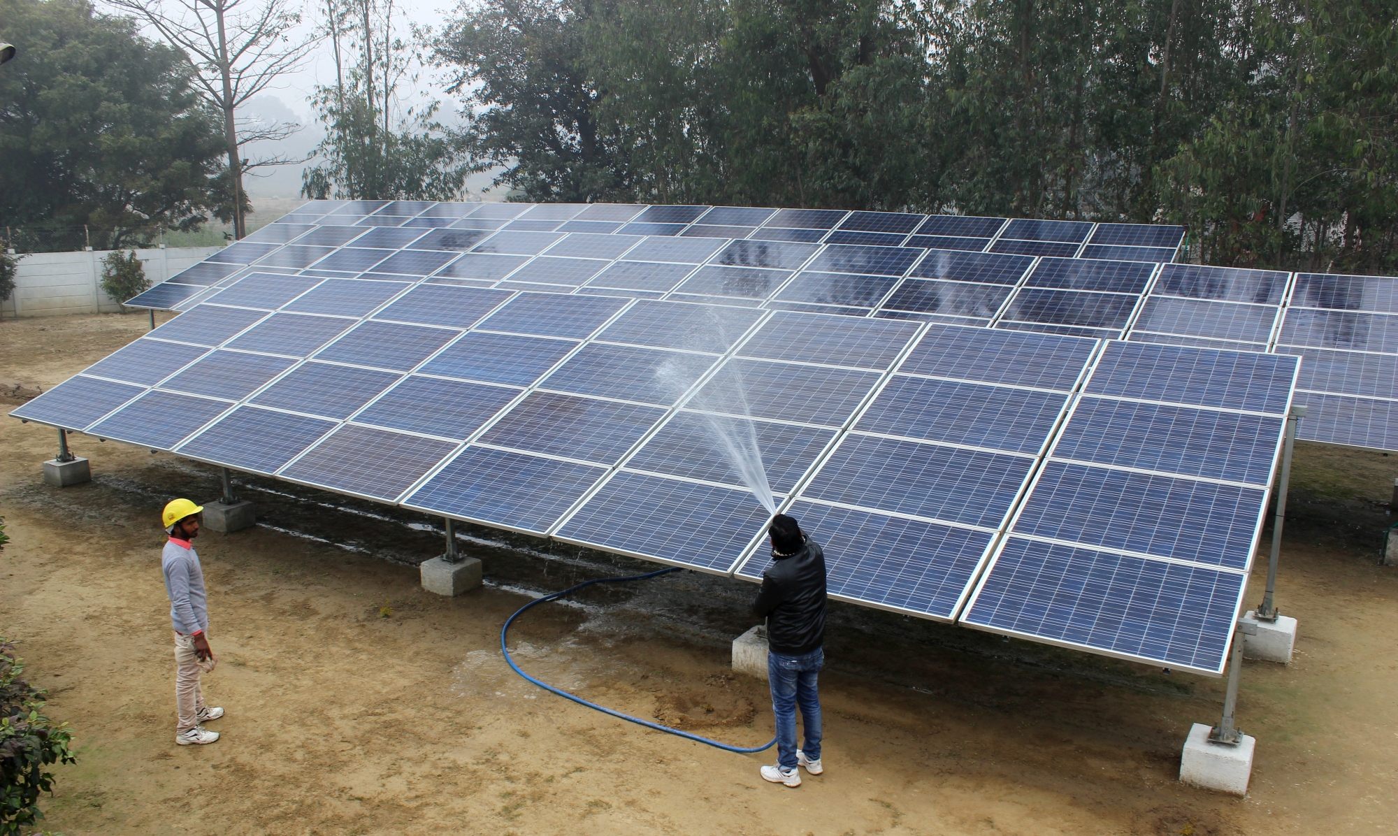 In a clearing in an acacia plantation, the more than 140 solar panels that make up the Kamlapur minigrid are being cleaned early in the morning.