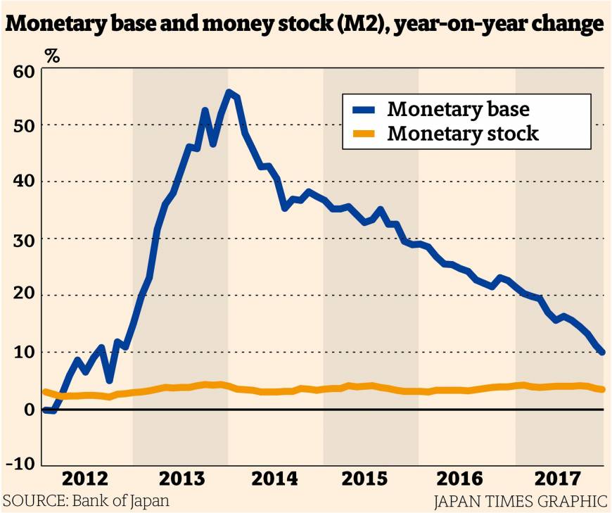Kuroda initially declared he would spark inflation by doubling the monetary base, or the sum of cash in circulation plus banks' current account balances at the BOJ — through purchases of JGBs and other financial assets.