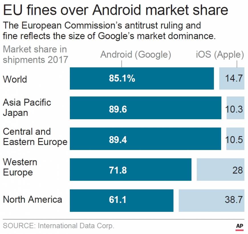 Google gives Android mobile software for free to handset-makers but coerces them to pre-install Google's apps if they want the Play app store, which offers more than a million programs. The search giant also pays phone manufacturers, telecommunications carriers and other browser-makers to run Google's search engine and collect user data, deals the company doesn't disclose. Thanks to those agreements, Google has captured almost $50 billion in yearly mobile ad-market sales, or a third of the global market, according to research firm EMarketer.