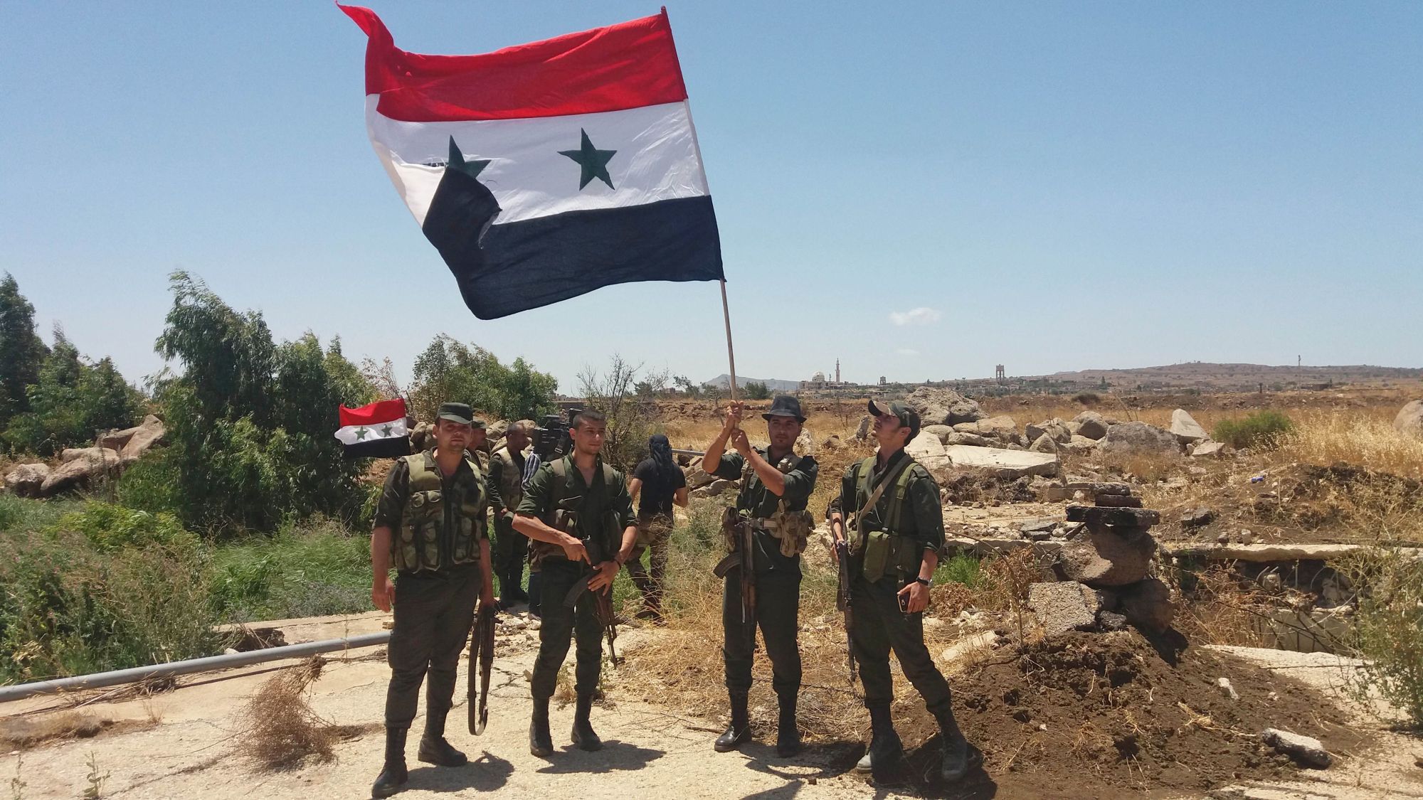 A Reuters photographer saw uniformed men raise the Syrian national flag and the black, white, green and red flag of President Bashar Assad's Baath Party in the long-abandoned city. No weapons were immediately visible.