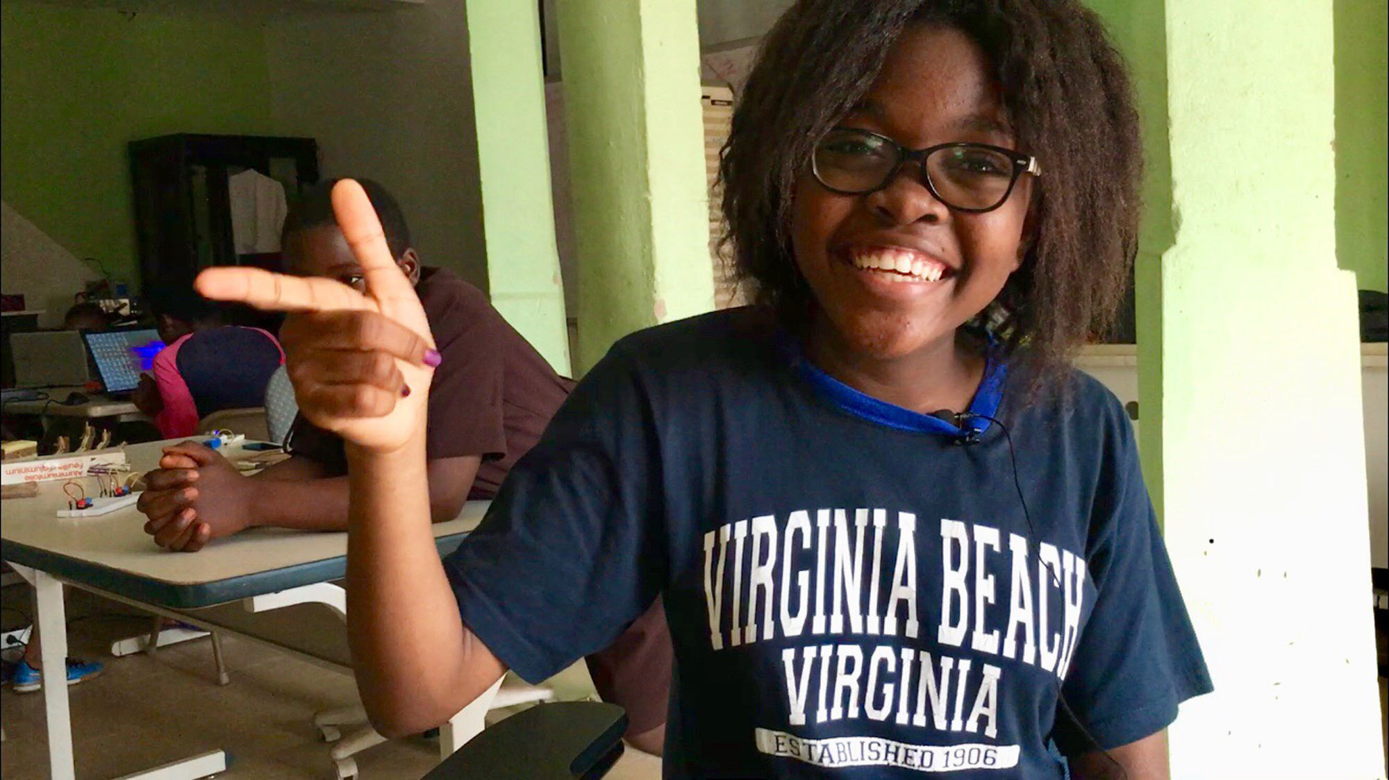With a flash of green light, a robot sputters and whizzes across the room, obeying the remote control commands 15-year-old Xaviera Nguefo and her team send its way.