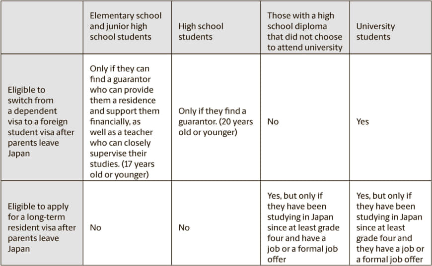 According to the Justice Ministry, if foreign workers leave Japan and their children are 17 or younger and wish to remain in the country, the children must find a guarantor who can provide a place to live and support them financially in order to apply for the student visa.