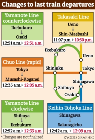 JR East says 17 lines running through Tokyo and extending into Saitama, Kanagawa, Chiba, Gunma and Tochigi prefectures will see their last trains running up to 37 minutes earlier, in a change of unprecedented scale for the firm.