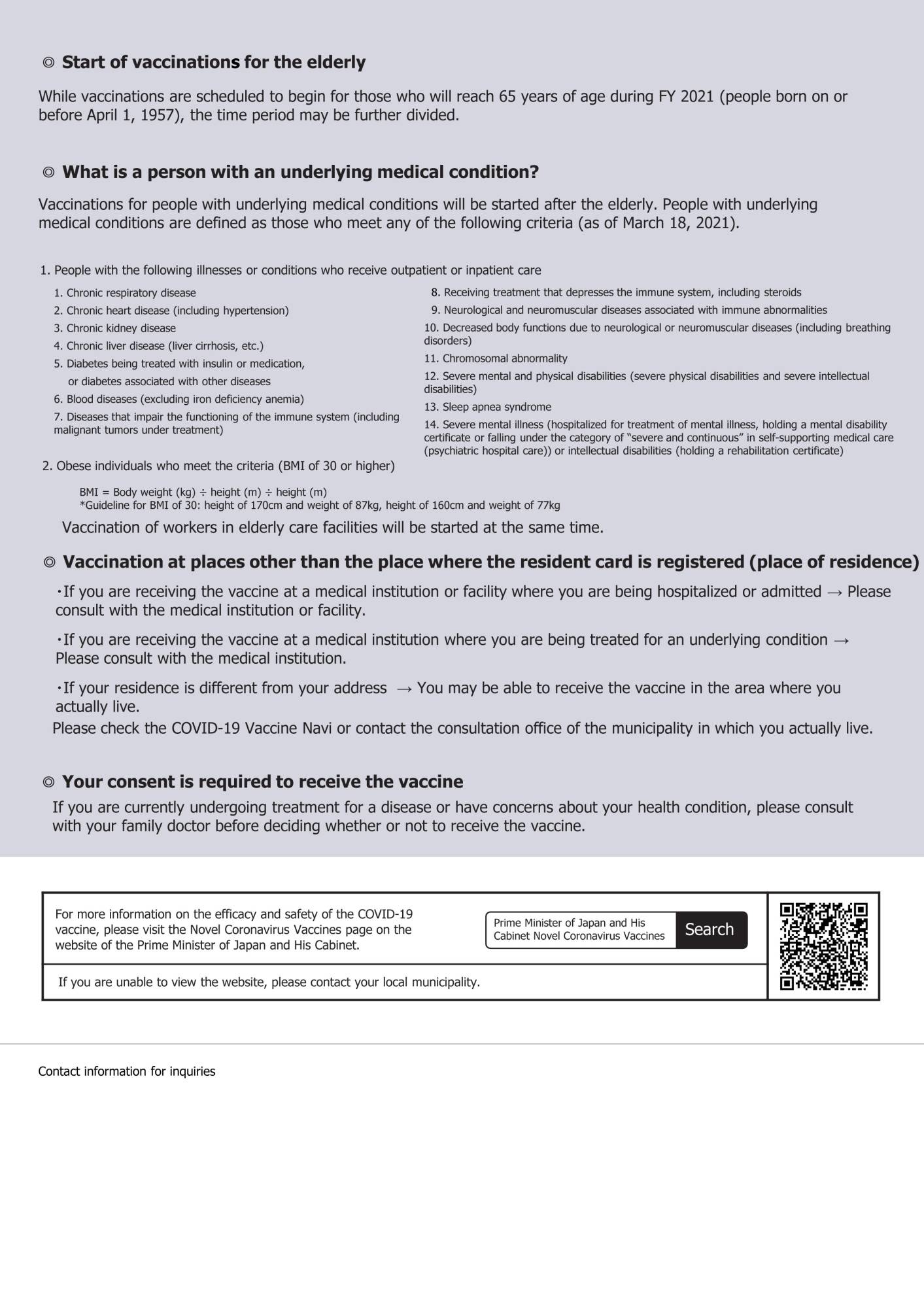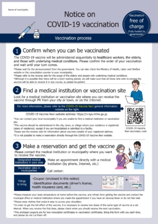 The Japanese documents will be sent by mail beforehand to registered residences to make sure people understand about COVID-19 vaccines. When it is a person’s turn to be vaccinated, he or she needs to make a reservation online or by phone at a clinic or vaccination venue in their municipality.
