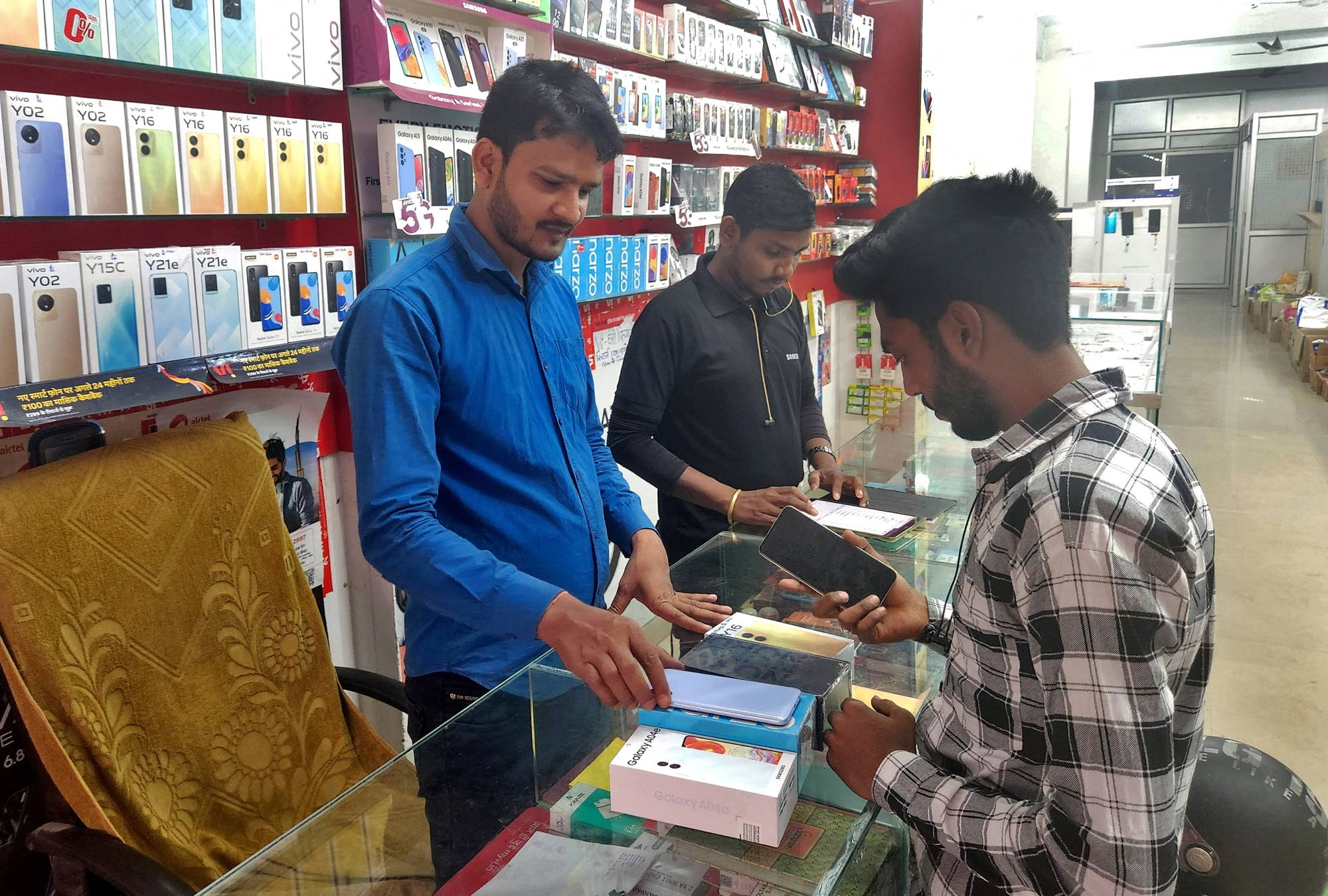 Sanjeev Kumar Verma, owner of a nearby multi-brand phone shop, has benefited from the company's loan scheme. Speaking in his shop, where hundreds of phones are stacked on shelves, Verma said he used to sell five Samsung phones each month, but has quadrupled that to 20 now, 18 of which are via the loan scheme.
