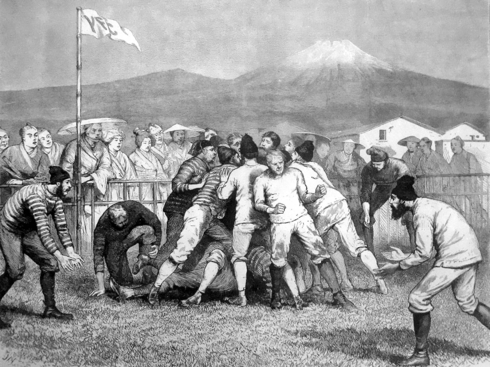Rugby reached Japan’s shores in 1863, according to Kanto-based sports historian Mike Galbraith, who cites a record of a game played by non-Japanese residents. In 1866, Rugby School alumni were among those who established the Yokohama Foot Ball Club, while British residents and visiting sailors played games in other port cities such as Kobe in the 1870s, he adds.