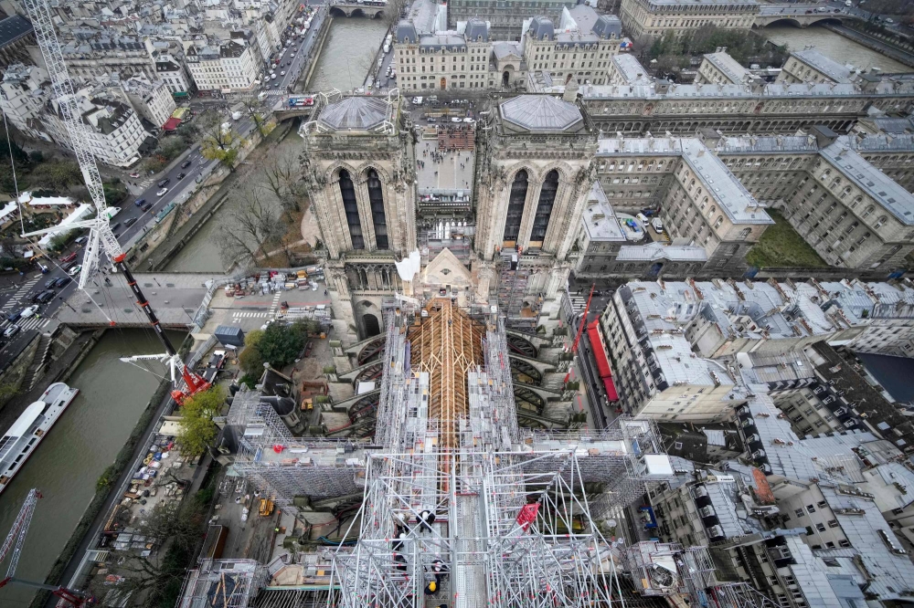 The spire is expected to be finished by the end of the month. Carpenters are also nearly done with a new triangular wooden attic to replace what used to be called the "forest” — a latticework of ancient timbers that was ravaged by the fire.