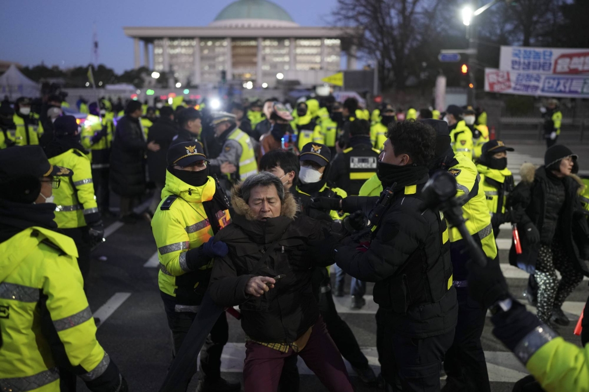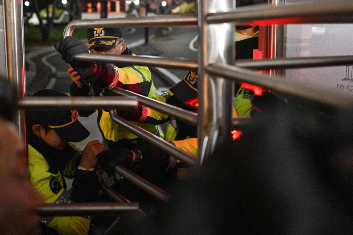 Chants of "Arrest Yoon" and "Impeach Yoon" echoed through the night air in front of thick lines of policemen guarding the perimeter and barring journalists from entering the seat of the country's hard-won democracy.