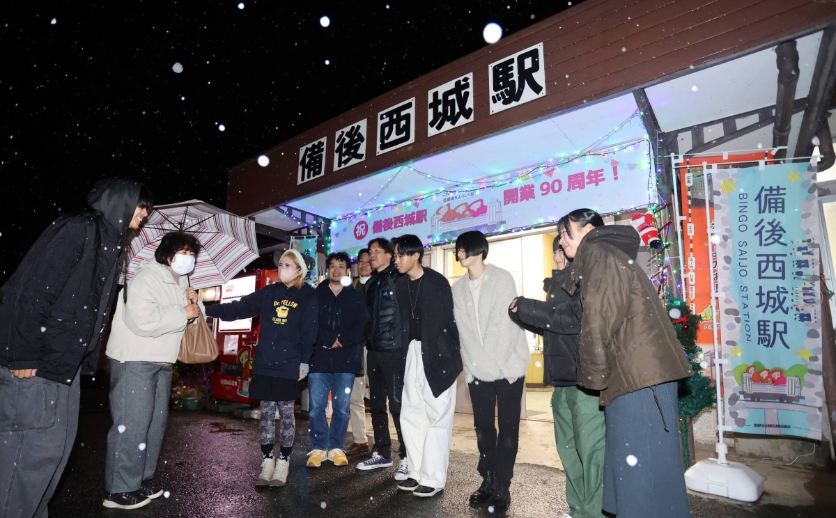One evening in mid-December, the central Saijo area in Shobara was quiet, with no one in sight on the street. In the darkness, silence reigned over the town surrounded by mountains — until the sound of a live band performance began to resonate from the Geibi Line's Bingo-Saijo Station.