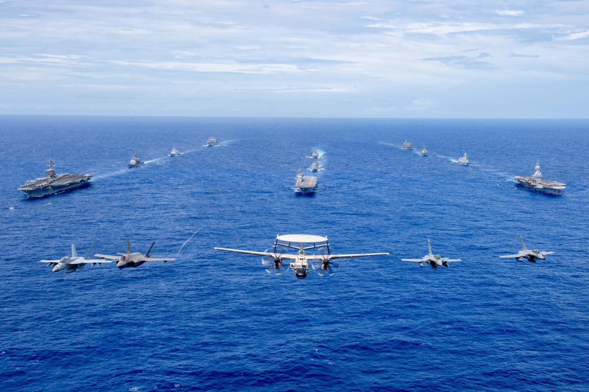 The CSG on Tuesday concluded the French Navy’s first-ever joint carrier maneuvers with the United States and Japan in the Philippine Sea. Those maneuvers, which also involved the USS Carl Vinson aircraft carrier and the JS Kaga helicopter carrier, were part of the Pacific Steller drills.