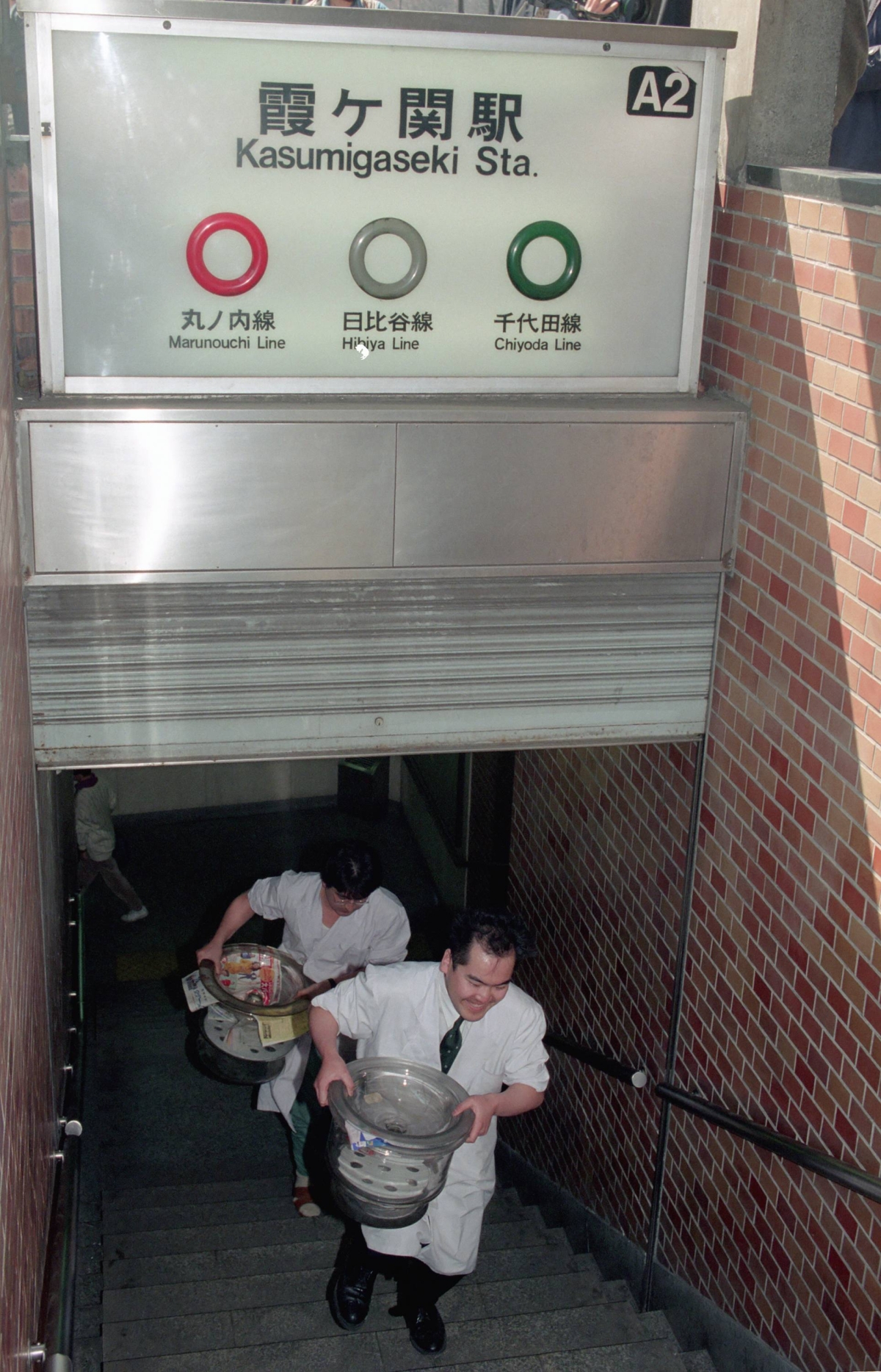 The following day happened to be a public holiday, so Sugiyama and his counterpart decided to reschedule and take the day off to get some rest. It was a fateful choice. At a little after 8 a.m., at the peak of morning rush hour, members of the doomsday cult Aum Shinrikyo punctured bags containing liquid sarin on five train cars on the Hibiya, Chiyoda and Marunouchi subway lines, unleashing an extremely toxic compound that spread through subway cars packed with commuters passing through Japan’s political nerve center of Kasumigaseki.
