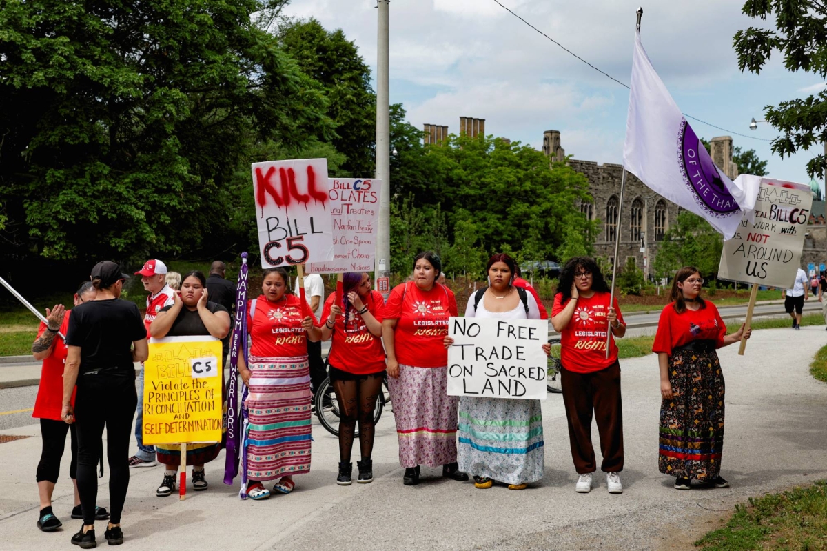 Demonstrators take part in a protest in front of the Legislative Assembly of Ontario against the federal government’s Bill C-5, on Canada Day, in Toronto, Ontario, Canada, on July 1. | REUTERS
