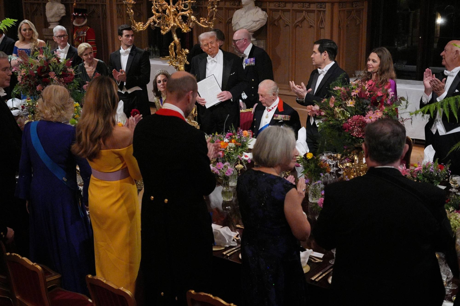 A military flyover rounded out the day before an elaborate dinner in the stately St George’s Hall featuring watercress panna cotta, chicken ballotine and ice cream bombe. An array of top Trump officials and allies paraded in white tie, alongside a phalanx of British royals — Catherine was paired with Tiffany Trump’s husband, Michael Boulos. As the crowd filled the hall, press secretary Karoline Leavitt could be seen chatting and U.S. tech executives like OpenAI Inc.’s Sam Altman were there in their formalwear.